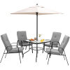 Perfect Selection for Outdoor Life: This outdoor furniture set consists of 1 square glass table, 4 chairs and an umbrella, creating a cozy space for relaxing, dining, and playing. You can place this 6-piece furniture set on your patio, poolside, backyard and other places to entertain your friends or enjoy happy family-gathering time.