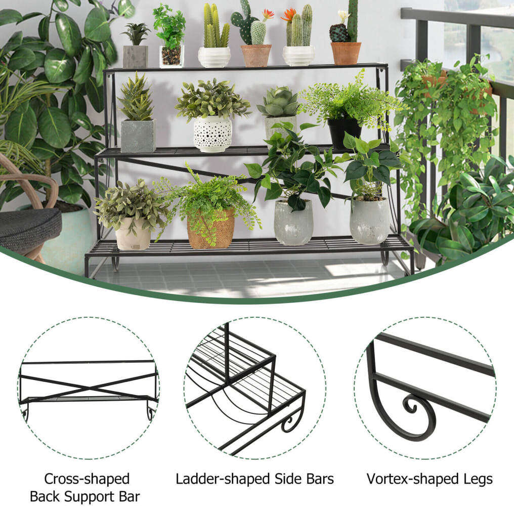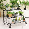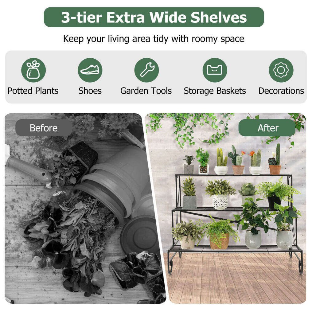 ● Versatile 3 Tier Wide Shelf: This tiered plant stand with 3 wide shelves provides ample storage space, allowing you to organize your pots and planting tools in an organized manner. What's more, the metal plant rack can also be used as a shoe rack and display rack to make your space more tidy.
