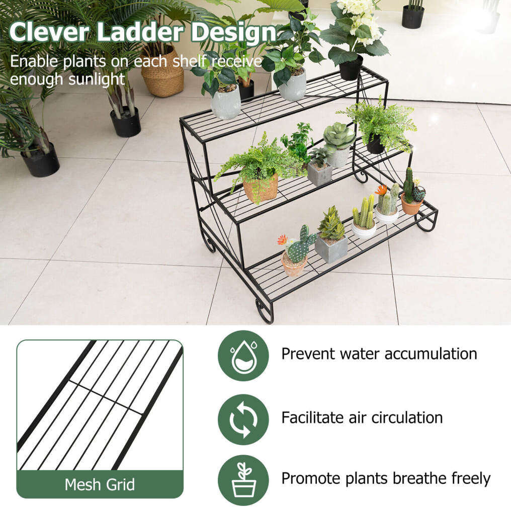 ● Ladder and Grid Design: Adopting clever stair style design, the 3-tier flower pot display shelf enable the plants on each shelf to receive enough sunshine for healthy growth. Moreover, each shelf comes with a grid design that facilitate excessive water to drain out and keeps each pot in place.