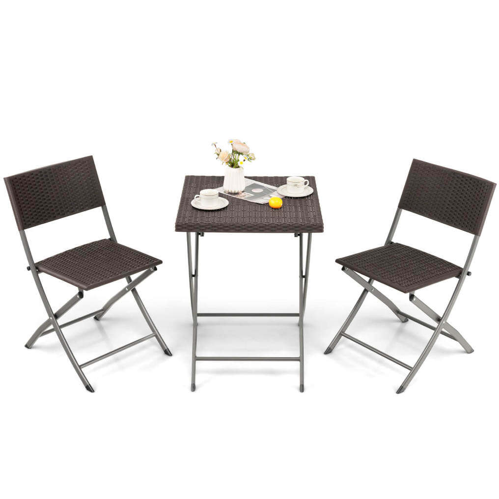 ● 3-piece Folding Patio Bistro Set: The square dining table and 2 patio chairs are foldable, which greatly saves your outdoor space when not in use. Moreover, the lightweight design (11 lbs for the table and 9 lbs for each chair) allows you to move them without hassle. And the installation is not required.
