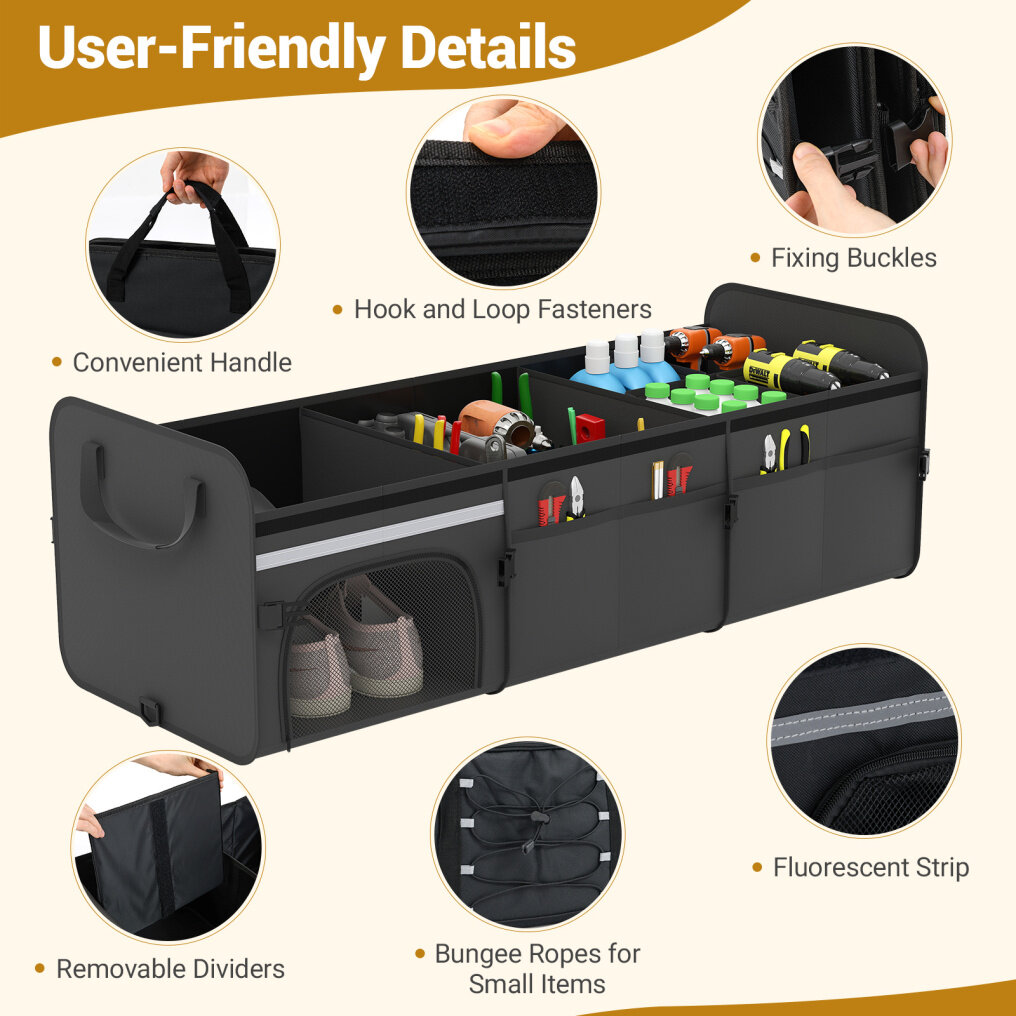 Firm Placement: With 2 adjustable straps and hook-and-loop fasteners, the organizer can stay firm at the car trunk. Moreover, the reflective fluorescent strips make the truck organizer glow for nighttime safety.