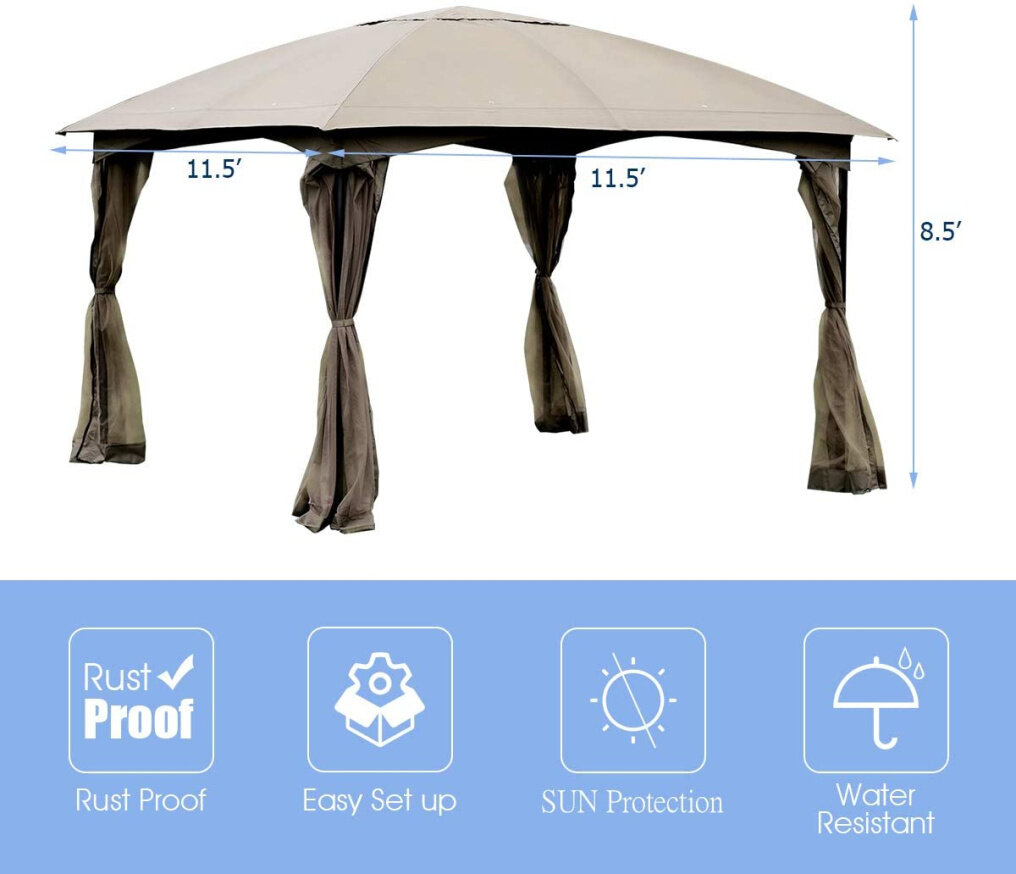 Built with sloping dome design help ensure proper water drainage. The loop straps allow you to conveniently fix the curtains onto the frame of your structure. With 11.5 ft length and 11.5 ft width, the gazebo tent is roomy enough for your party and relaxing in solace to entertaining guests. High quality mosquito netting with zippers, fully enclosed keeps you from disturbing mosquito and other insects. Ideal for daily or recreational use, such as parties, outdoor events, camping, picnics and any other occasion.