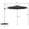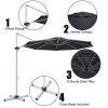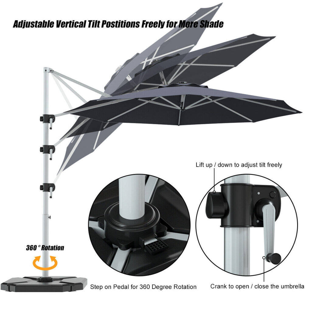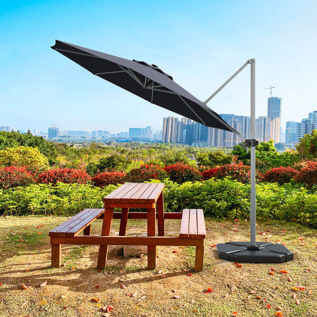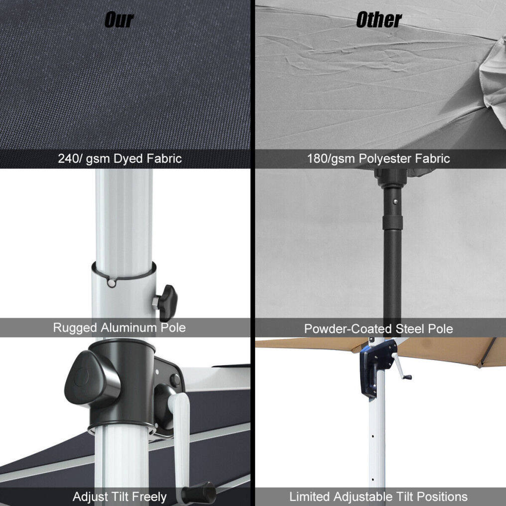 Made of a strong thick aluminum pole and 8 sturdy ribs, the patio offset umbrella is durable enough which has a long lifespan. Plus, the premium 240gsm yarn-dyed fabric canopy is fade-resistant while offering well sun protection. Besides, for maximum convenience, the offset umbrella can rotate 360 degrees to your preferred position by simply stepping on the foot pedal and turning the pole with your hands. It is worth mentioning that this round offset umbrella can adjust tilt freely and block the sun from various angles. More, the patio umbrella with a cross base makes your umbrella stay firm. By the way, the operation and assembly of the patio umbrella are simple.