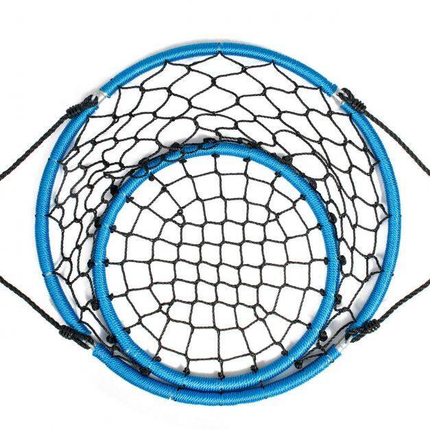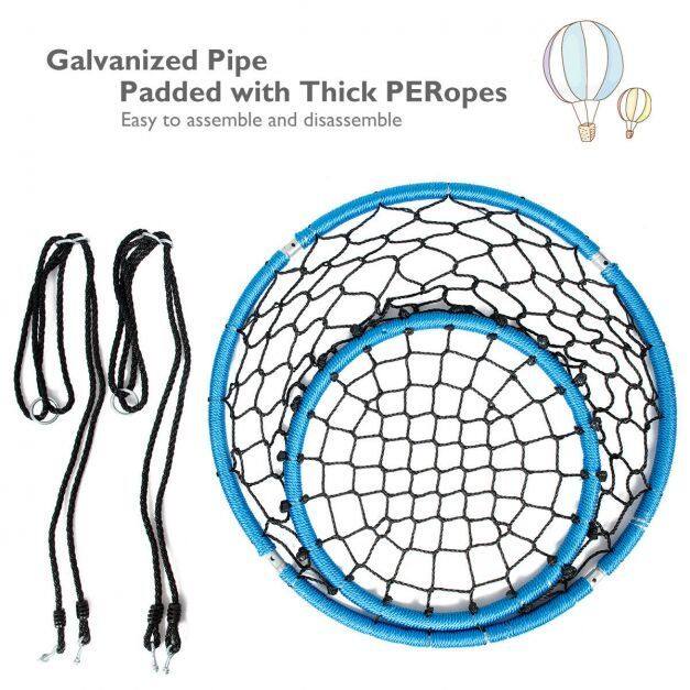 Made of sturdy galvanized pipes and thick ropes, this web chair swing will have your kids playing for hours on end. It is built to withstand 150 kg of static weight and features a round base with strong PE ropes that will last. And you can freely adjust the height of the ropes to meet different needs. It can be easily connected to trees or swing hangers. Your kid can safely sit, play, read and chat on the swing. This pleasing appearance and practical application will definitely satisfy your needs. It is the best gift for your kids!