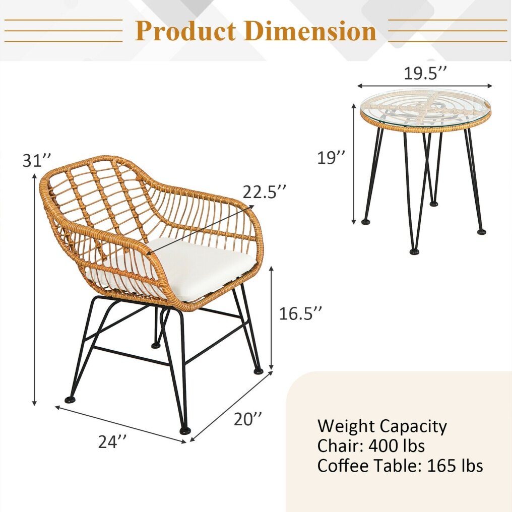 ● Dimensions and Easy Assembly: Size of chair: 24" x 22.5" x 31" (L x W x H) ; Seat height: 16.5" ; Size of coffee table: 19.5" x 19" (D x H) ; Weight capacity of chair: 400 lbs; Weight capacity of coffee table: 165 lbs. This patio conversation is set to come with detailed instructions and complete parts, making it easy for you to assemble bedroom.