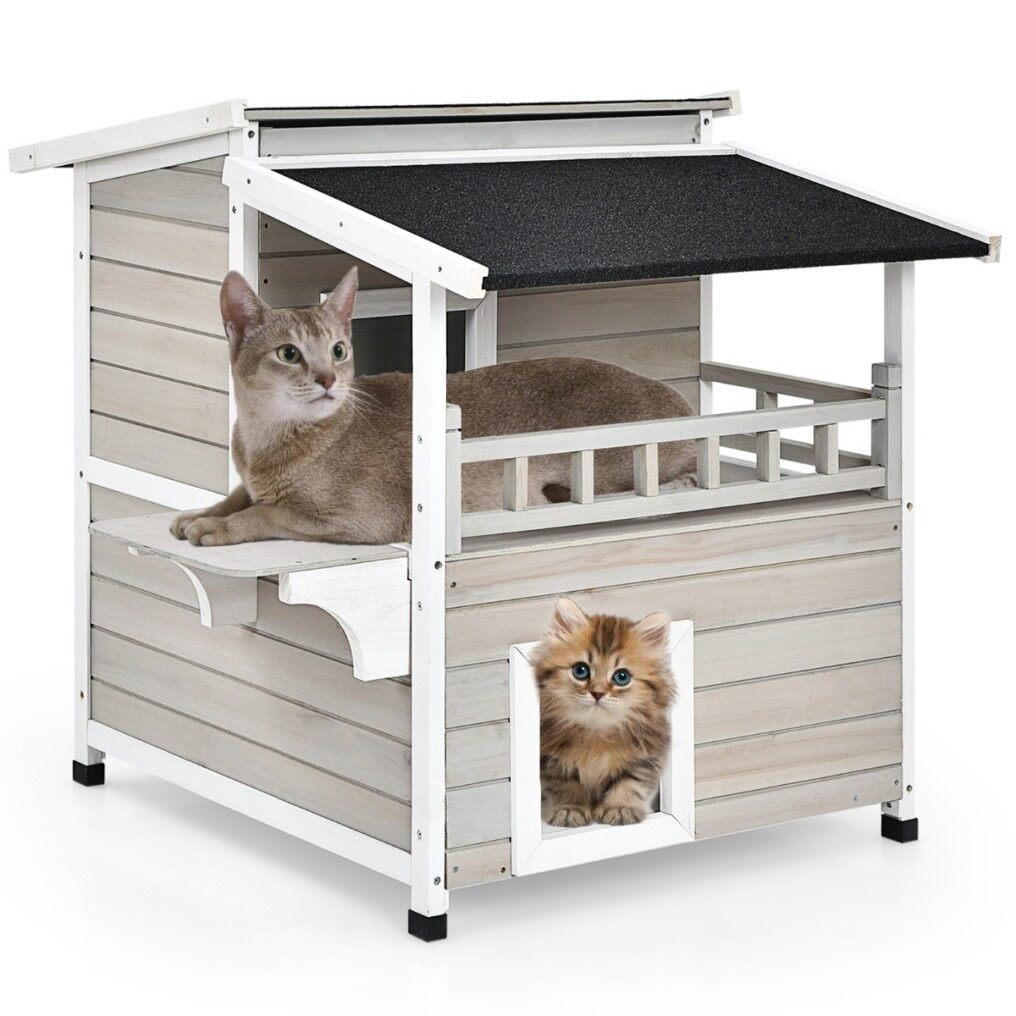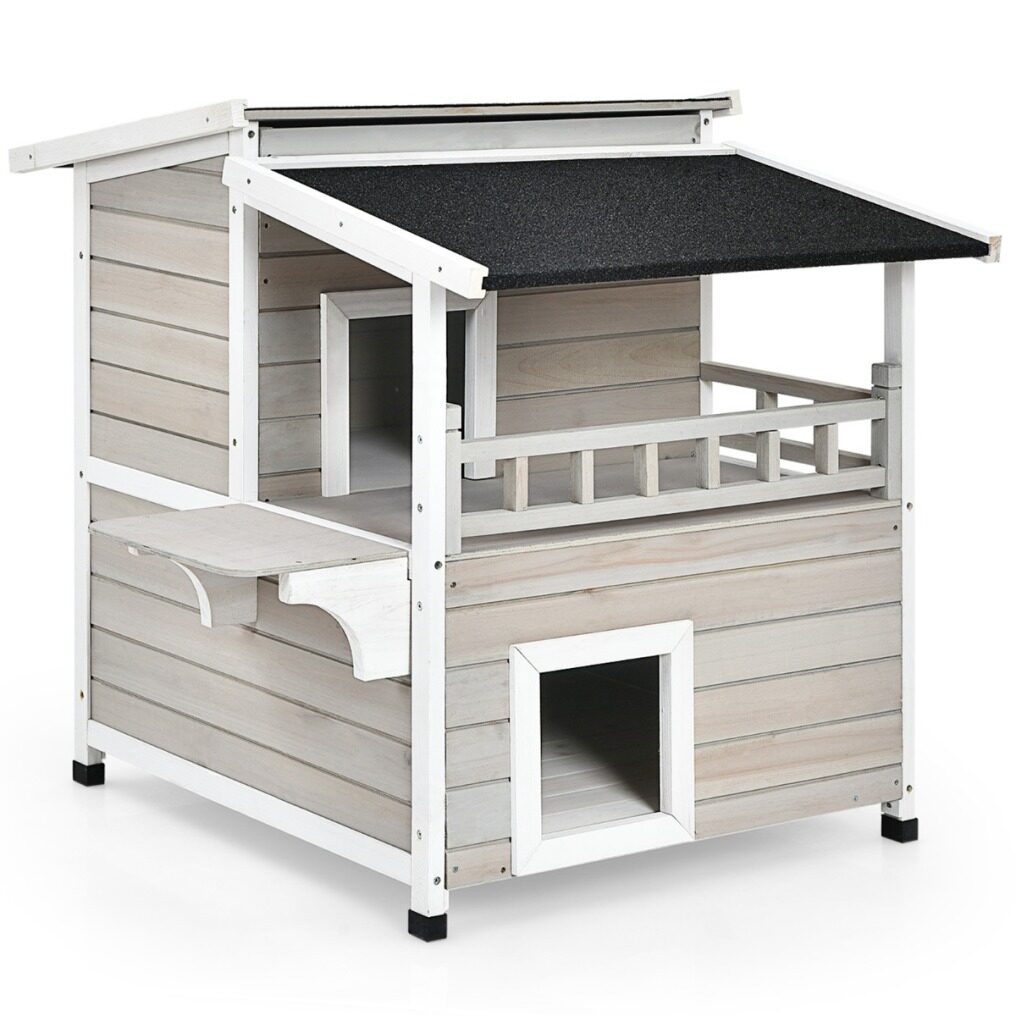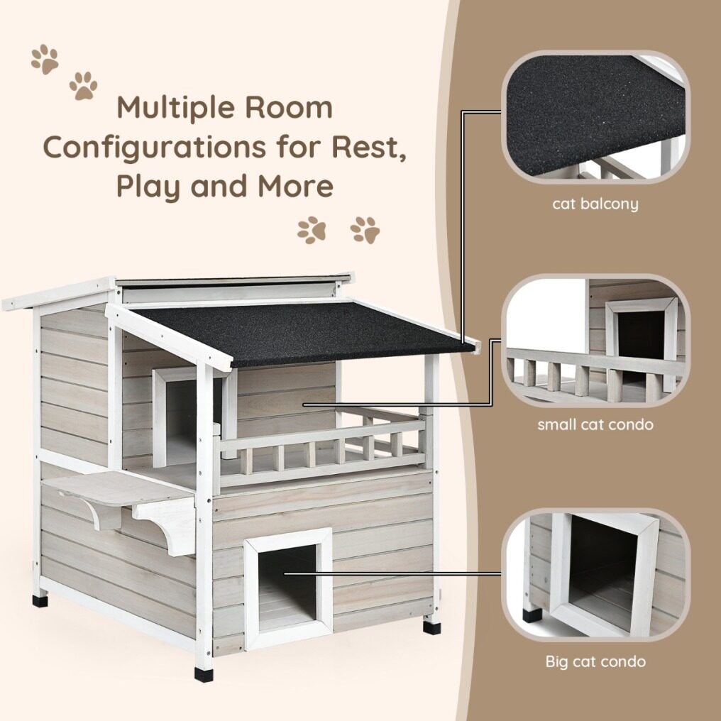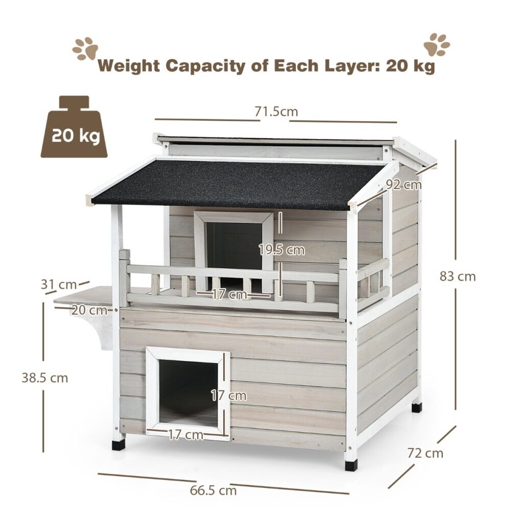 2-story design with a balcony makes sure your cats get enough rooms for playing and resting. And the jump platform gives cats a lift to leap towards the second floor and for fun. It is suitable to stand indoors and outdoors with a water-proof and sun-proof asphalt roof. Using firwood as the main frame, this cat condo is durable and reliable while 4 raised legs guarantee a stable standing. It is a sweet home for cats, bunnies, small and medium-sized dogs. Besides, it is easy to assemble following the attached instruction.