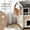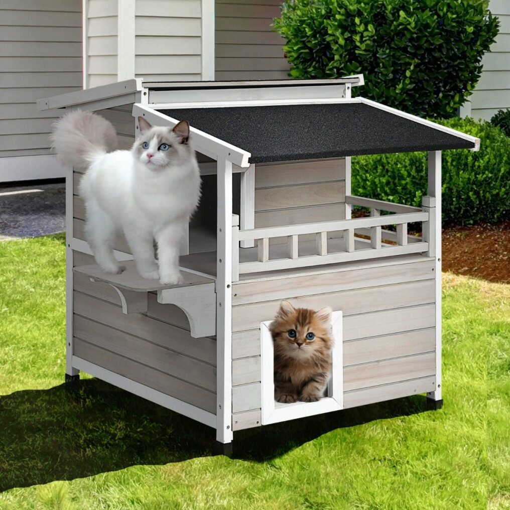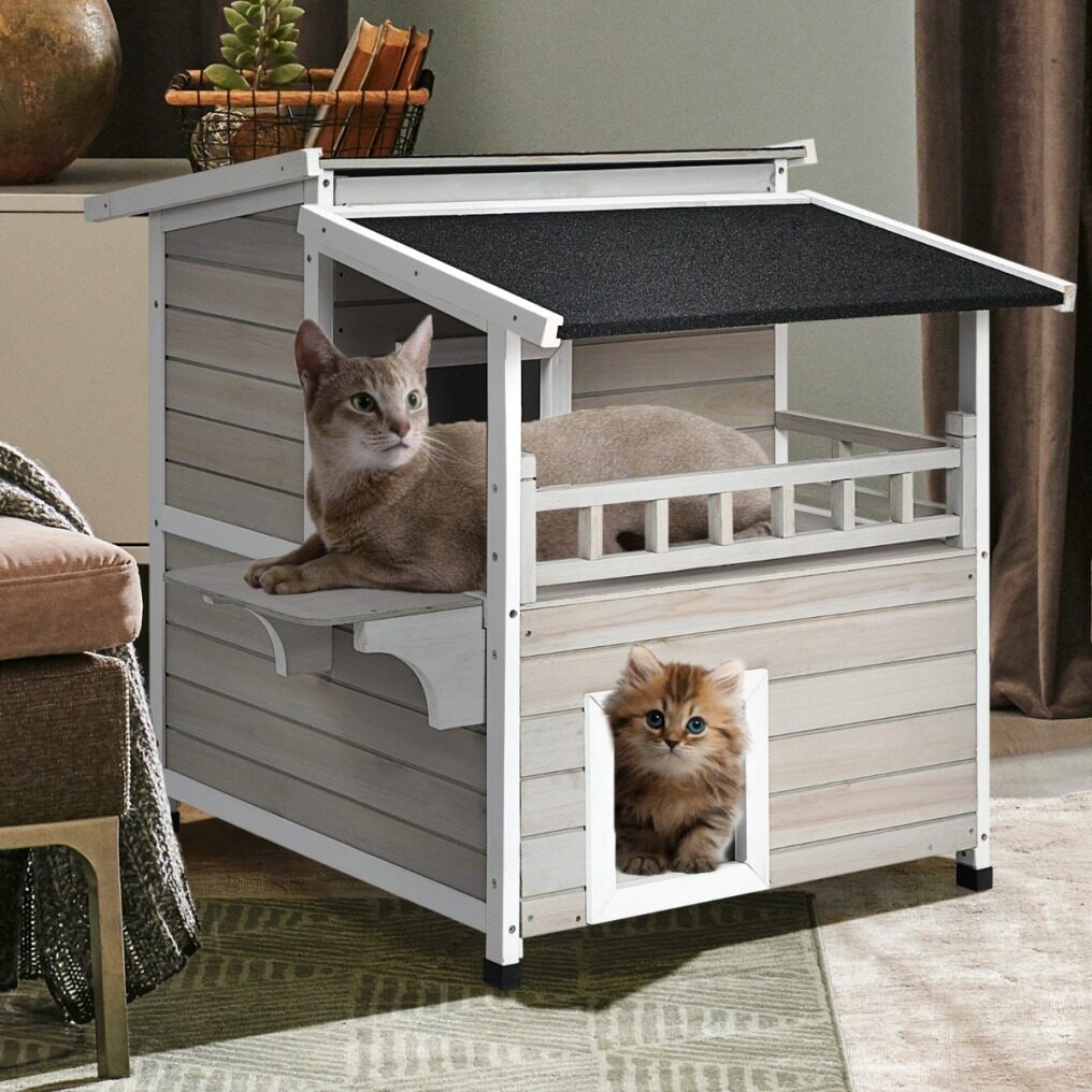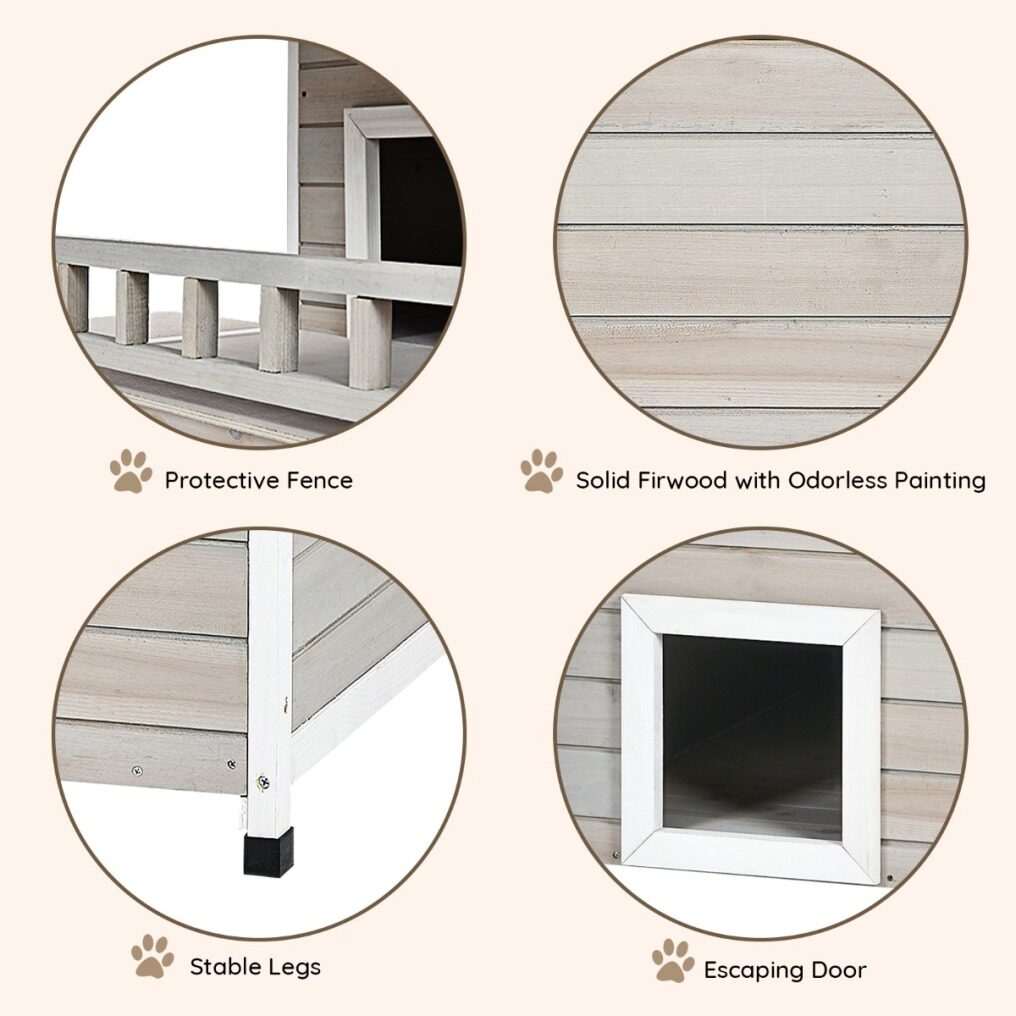 2-story design with a balcony makes sure your cats get enough rooms for playing and resting. And the jump platform gives cats a lift to leap towards the second floor and for fun. It is suitable to stand indoors and outdoors with a water-proof and sun-proof asphalt roof. Using firwood as the main frame, this cat condo is durable and reliable while 4 raised legs guarantee a stable standing. It is a sweet home for cats, bunnies, small and medium-sized dogs. Besides, it is easy to assemble following the attached instruction.