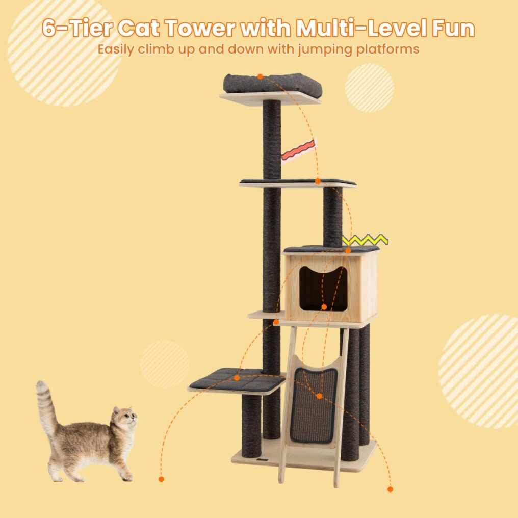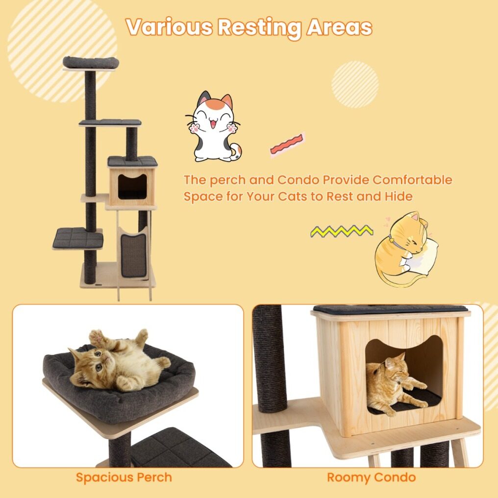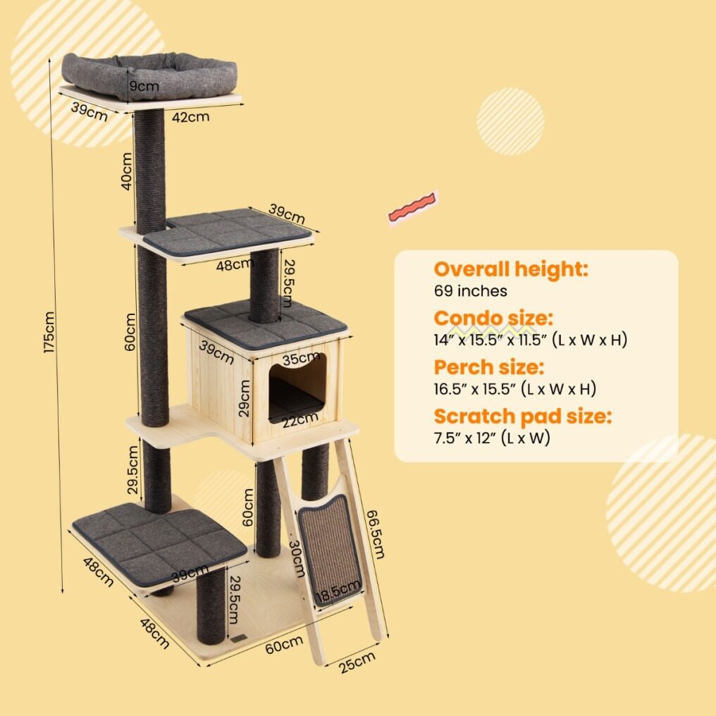 Our 175cm wooden cat tree comes with a large condo, 2 jumping platforms, and a top perch, satisfying felines’ natural instincts and keeping up their fitness. This is an all-in-one cat activity center for having a rest, taking a nap, jumping up and down, sunbathing, and enjoying the scenery out of the window. More importantly, in contrast to normal cat towers, this cat tree is crafted with natural pine wood and birch wood, ensuring great sturdiness, safety, and durability. And the weights of all columns and platforms are evenly distributed, so it would not easy to wobble or tipping over. Besides, thanks to the all-wrapped scratching posts and a scratching board, it is convenient for kittens to climb and sharpen their claws while protecting your furniture from scratching. And all platforms are covered with soft mats, providing multiple comfortable sleeping areas.