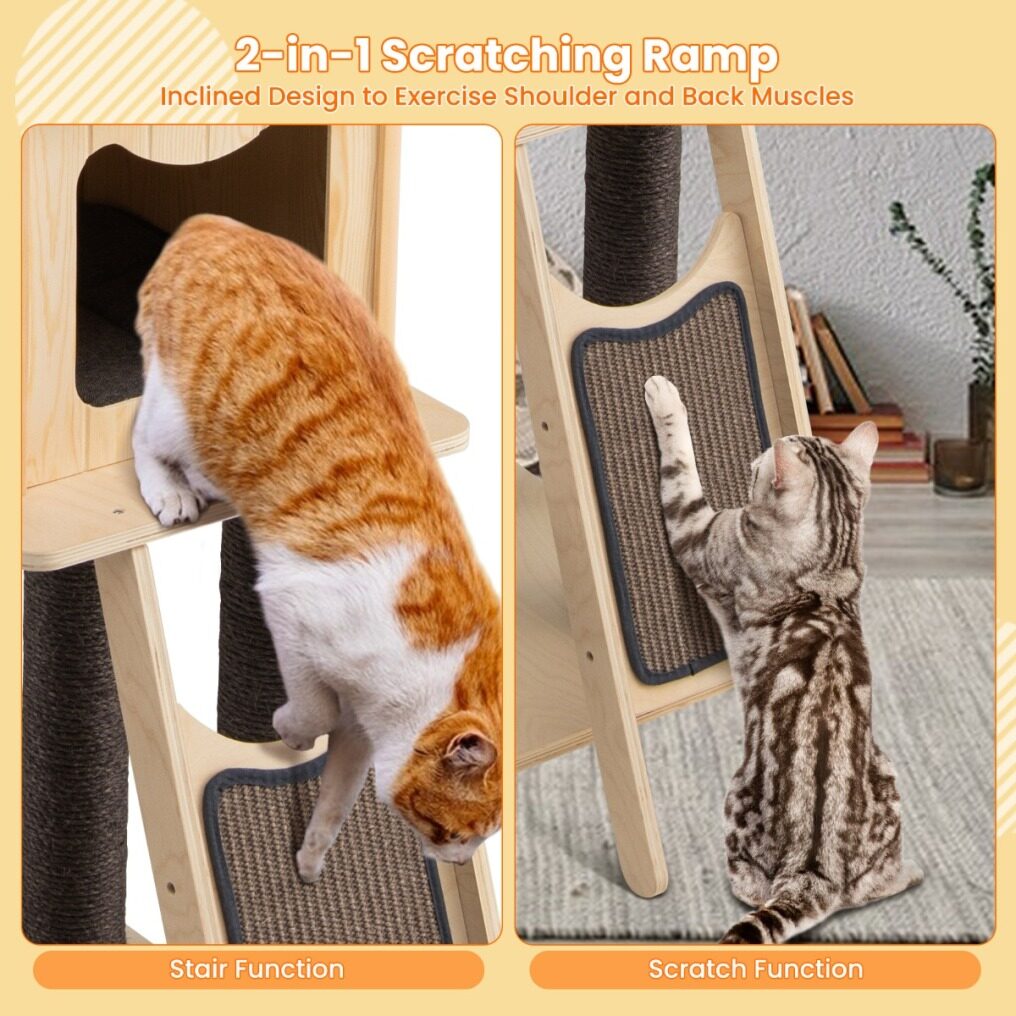 sisal-covered scratching posts & boardfully wrapped with natural sisal ropes, the scratching is healthy and safe while helping sharpen cat's claws, so your furniture would not be damaged. moreover, the ramp covered with a sisal mat not only increases the scratching experience but also helps cats climb to the condo.