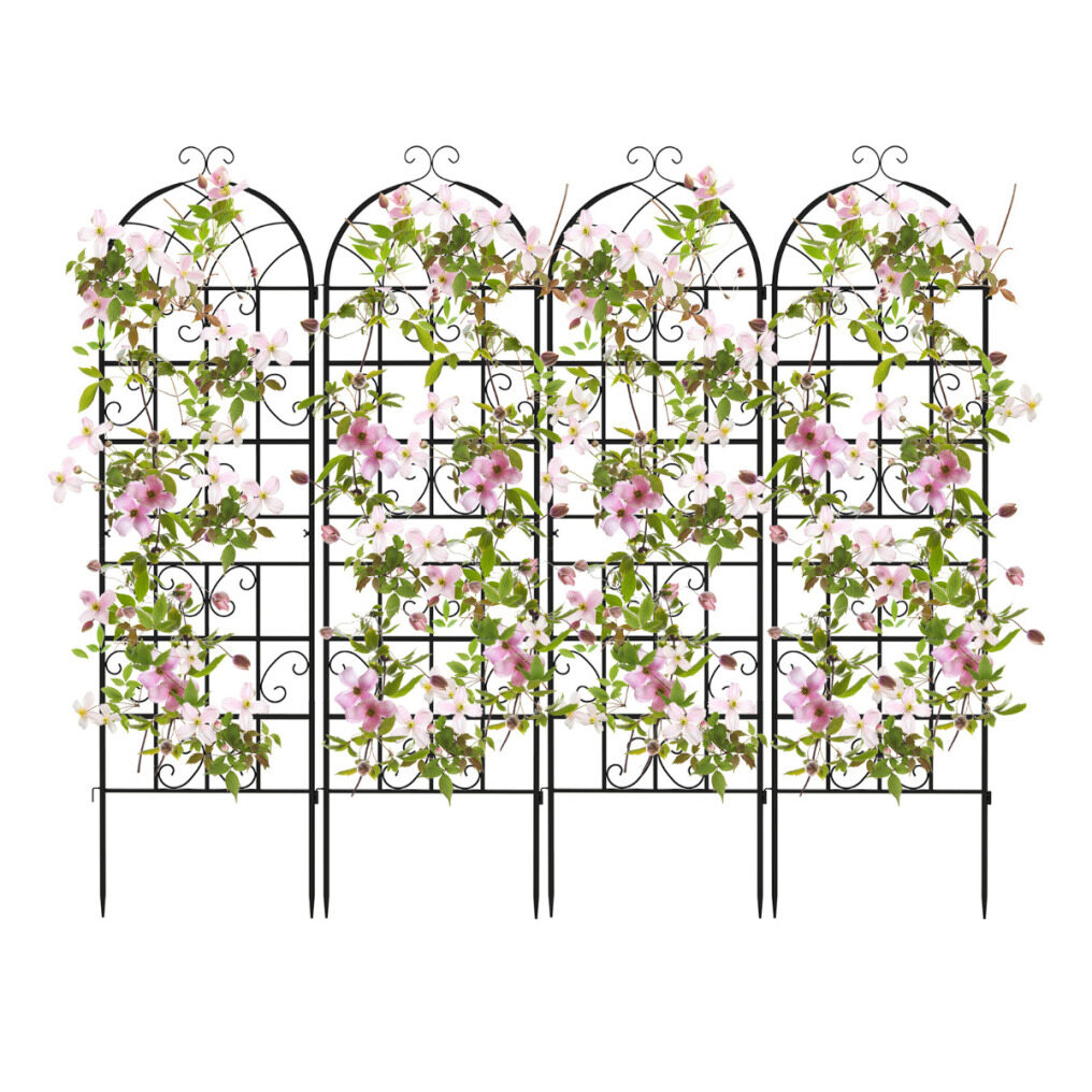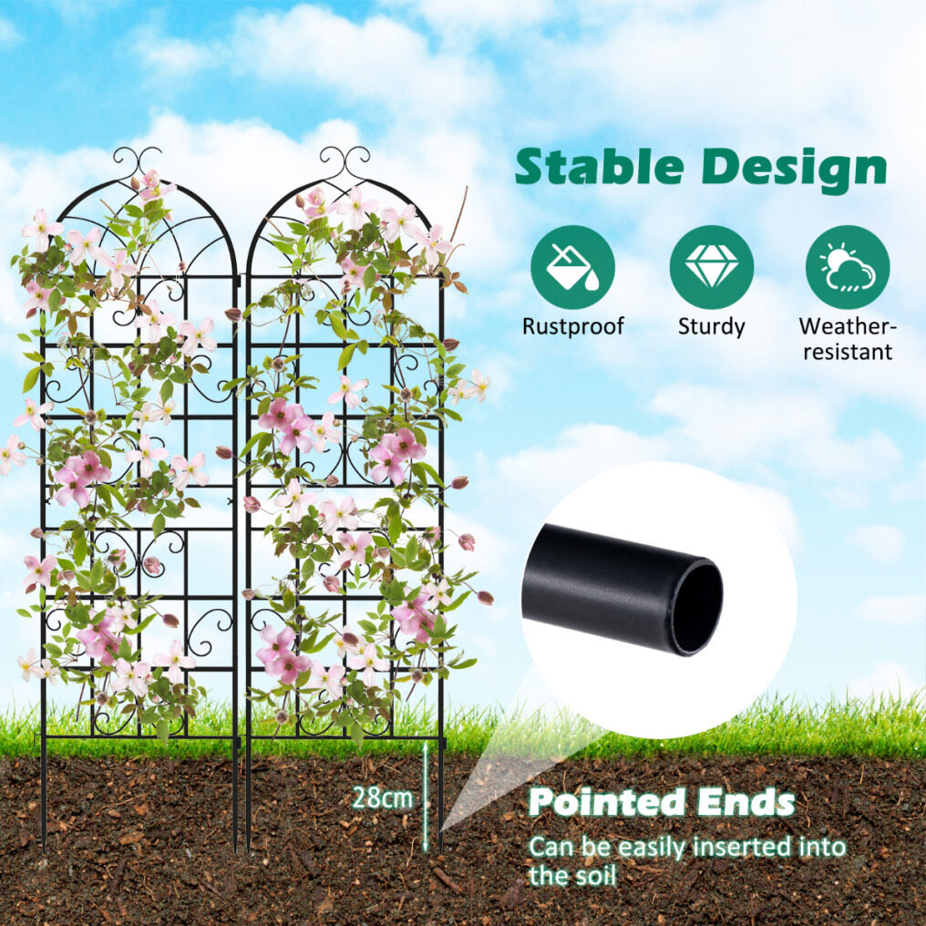 Rust-proof and sturdy frame: The decorative garden trellis is made of galvanized metal, which is resistant to deformation, rust-proof, and weather-resistant, ensuring long-lasting use. Equipped with sharp ends, it allows for easy insertion into the ground, ensuring stability.