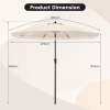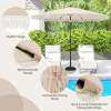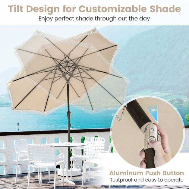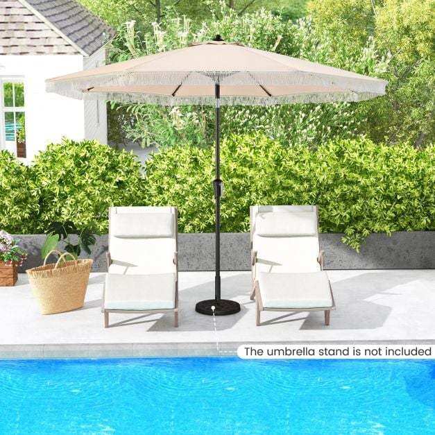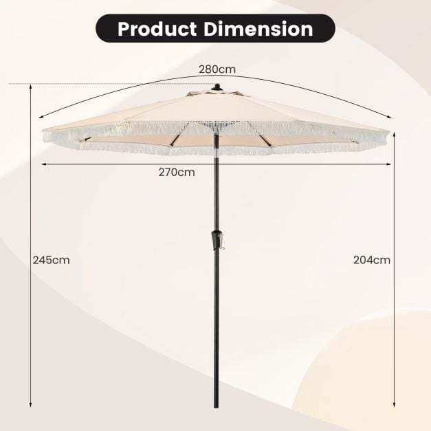 Our 280 cm outdoor patio umbrella offers spacious coverage for a set of furniture, which is ideal for creating a cozy space for leisurely days with your loved ones. Whether it's a backyard BBQ, poolside lounging, or outdoor dining. Not only does the polyester canopy provide better sun protection but also the tilting design allows you to enjoy optimal shade throughout the day. Besides, it boasts a crank handle, making umbrella opening and closing a breeze. And thanks to the safe latch design, there is no need to worry about the umbrella closing suddenly. Particularly, this umbrella is adorned with tassels and you can add decorative accents on the protective rib pockets, adding a personalized and sophisticated touch to your outdoor space.