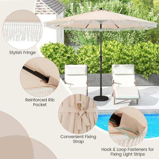 Stylish and Elegant Appearance: This patio umbrella measures 280 x 247 cm (Dia. x H), offering ample shade for you and your loved ones to relax outdoors. It stands out with the decorative elegant tassels, adding a touch of elegance. Moreover, it features hook and loop fasteners for fixing decorations.