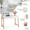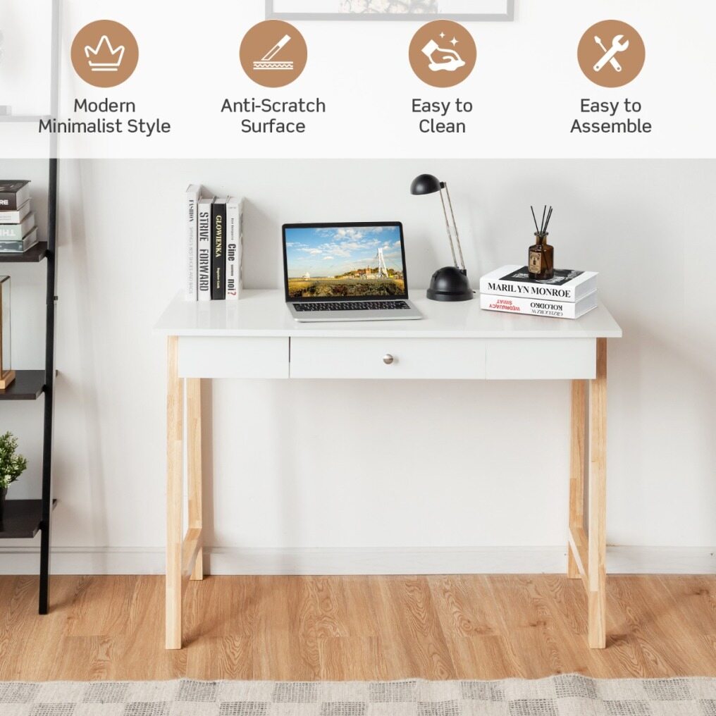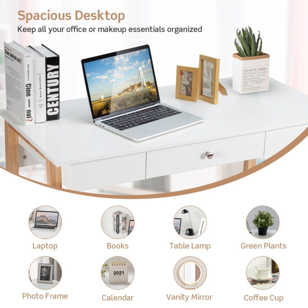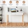 Our multifunctional computer desk will bring a lot of convenience and elegance to your life! The modern concise table can be used as a computer desk, writing desk and dressing table to meet all your needs. Featuring a spacious desktop and large drawer, this computer desk can organize your beauty essentials or office items in good order, offering you a neat working or make-up area. As for quality, this writing desk is made of premium MDF and solid wood legs, which ensure great stability and durability. 4 non-slip foot pads on the bottom provide effective floor protection and added stability. Smooth drawer slides and the round metal knob are designed for convenient use. Modern and simple style enables the desk to blend with any home decor easily and you can place this desk in the living room, bedroom or home office.