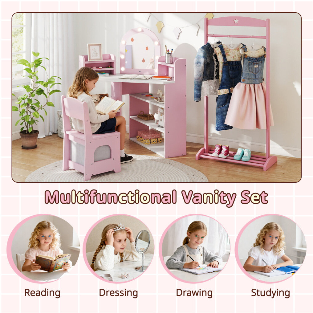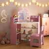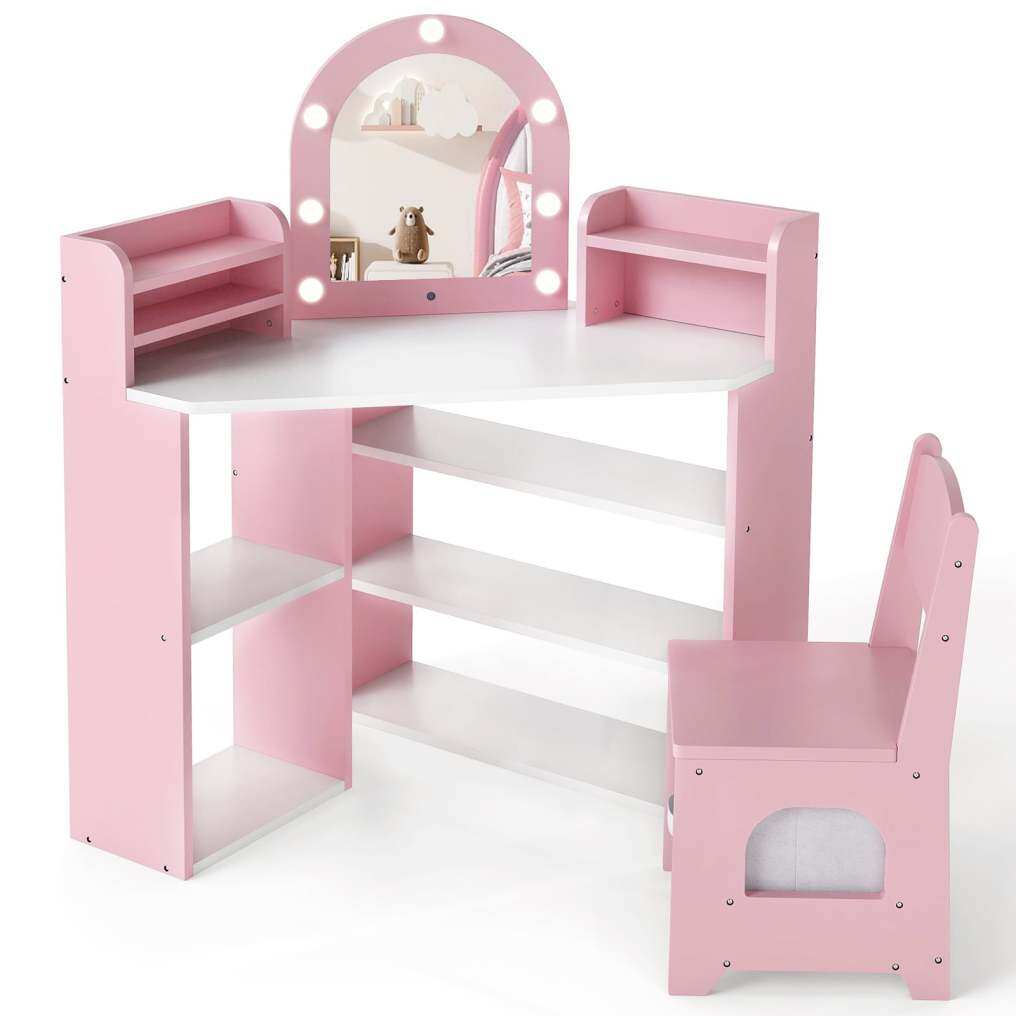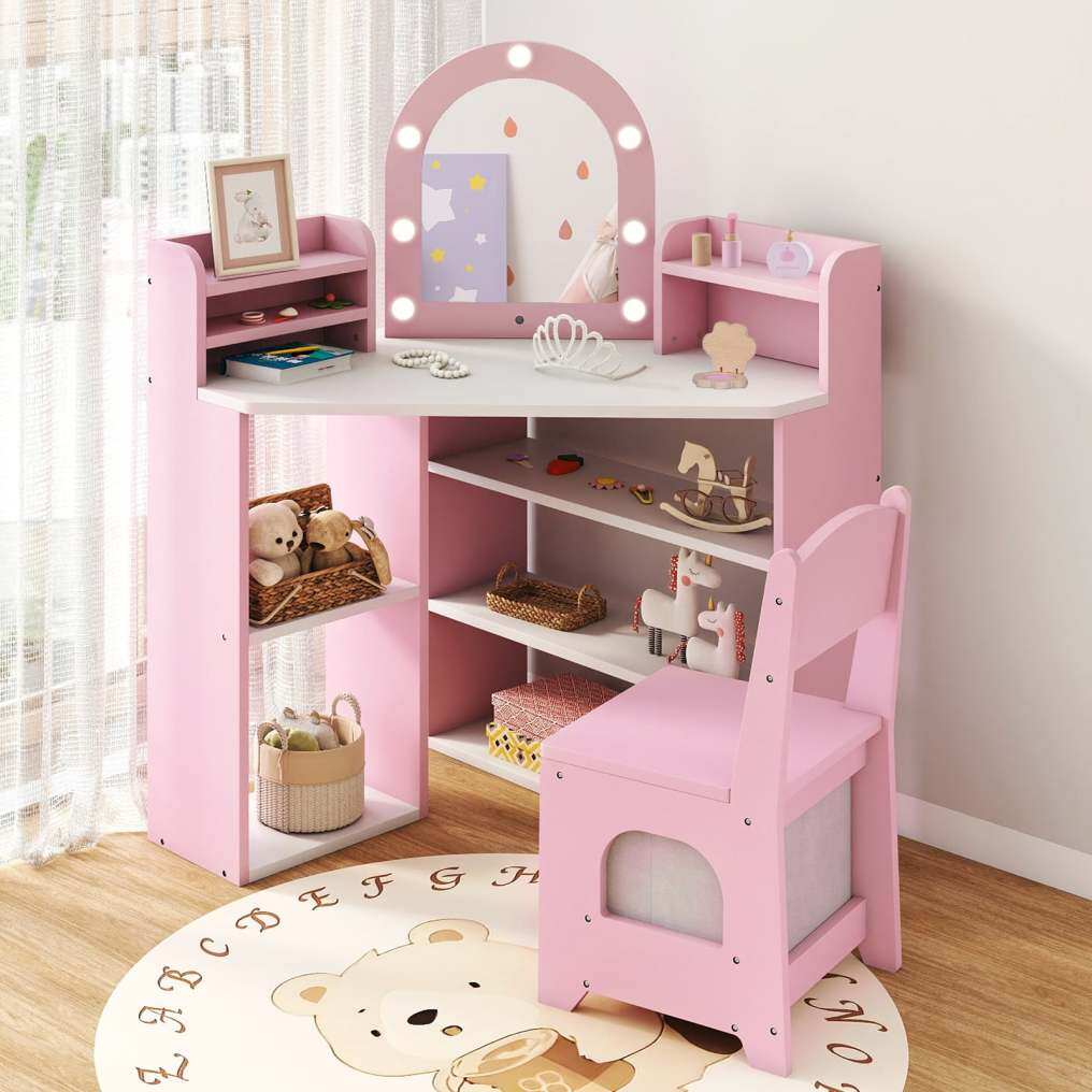 ● 2-In-1 Versatile Corner Desk: This vanity table with chair can also serve as a writing desk according to your needs. It is multi-functional, a perfect gift for a variety of children activities such as dressing, drawing, reading and playing.