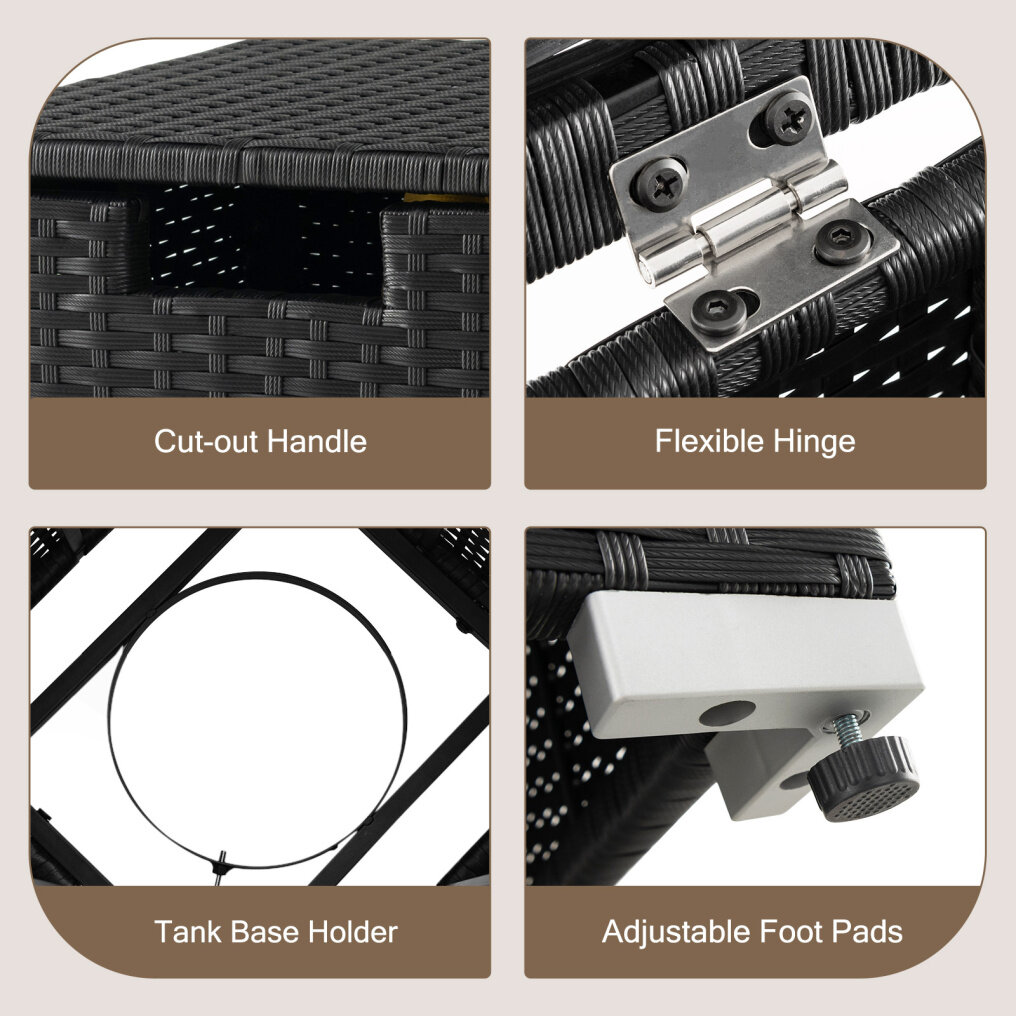 ● Simple to Use: The top lid is easy and safe to close and open with durable metal hinges. And the fixing ring with adjusting knob will tightly fix the gas tank in place. This gas tank cover table matches most propane gas fire pit and patio rattan sofas well.
