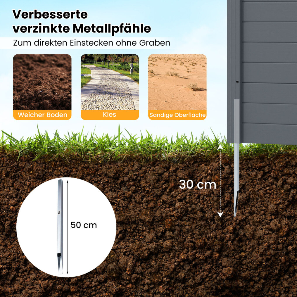 Improved stability and wind resistance: The privacy fence uses galvanized metal ground spikes instead of traditional plastic ground anchors, allowing for direct installation without excavation. The stakes extend 30 cm into the ground and are suitable for various soil types such as soft soil, gravel, and sand.
