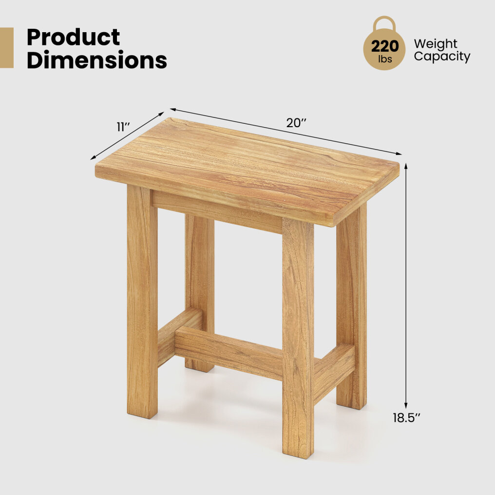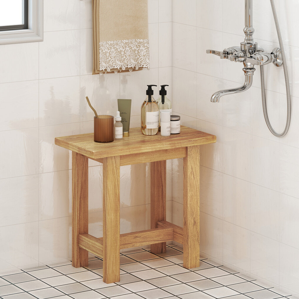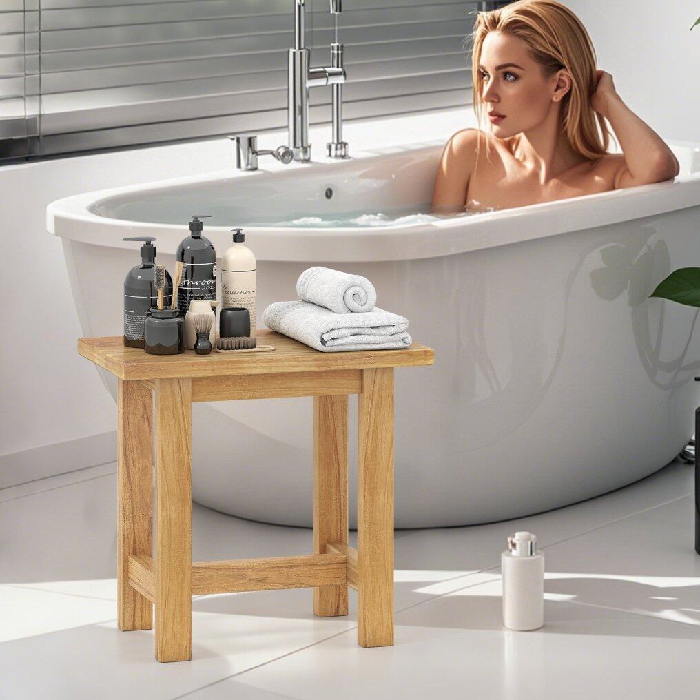 ● Solid Wood Construction: This teak shower stool is crafted with teak wood known for its high hardness. Finished with a water-based paint, the wooden shower bench not only enhances your bathroom's aesthetic but also ensures durability.