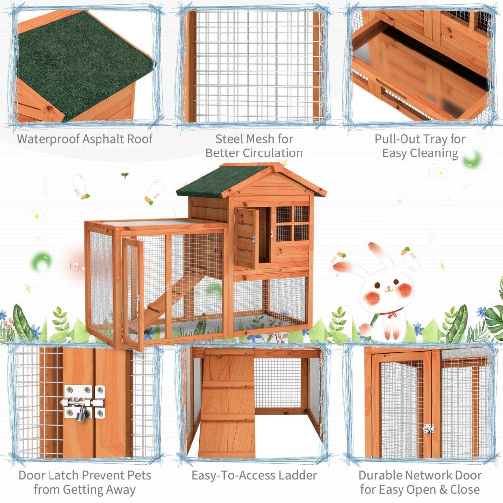 ● A Perfect Gift for Small Pets: This 2-tier hutch provides your little friends an exclusive house that makes them feel cozy and safe in the backyard, porch, or garden, especially on cold and rainy days. Moreover, it can not only be used for rabbits but also guinea pigs, hedgehogs, chickens, and tortoises.