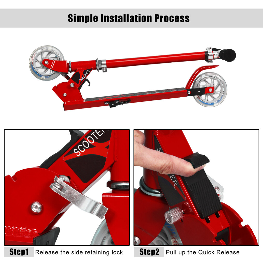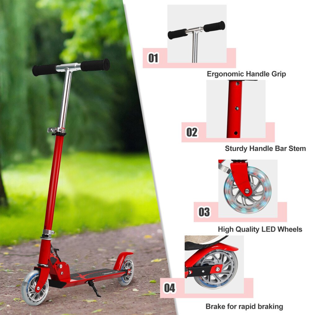 The scooter has PU wheels that are smooth and quiet; the high quality bearings reduce vibration and make a smoother ride. The rear wheel features LED light makes the children enjoy. The height is adjustable in three levels to meet children at different ages.