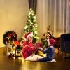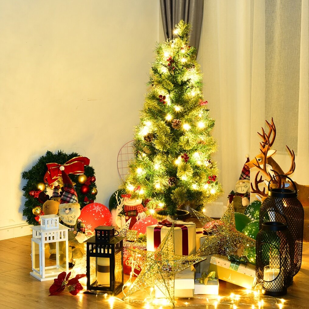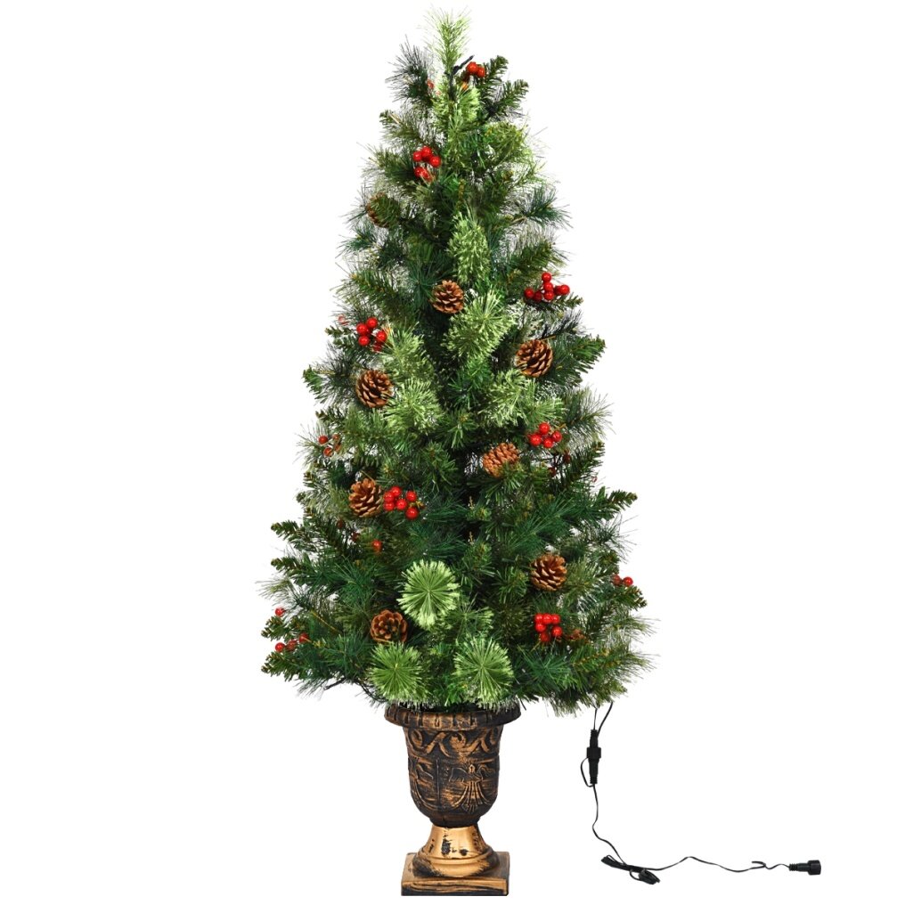 The Christmas tree is a handsome decoration for display in doorways, hallways, porches and patios. The tree is made of fade-and crush-resistant PVC needles, appearing fresh-cut and is pre-lit with warm white LED lights that are energy- saving and long lasting. The equipped gold urn base keeps the tree planted in an upright position. The tree comes with red berries and pine cones, with which you can decorate by yourself. The Christmas tree has great quality, adding a fantastic festive atmosphere to your home and is your best choice.