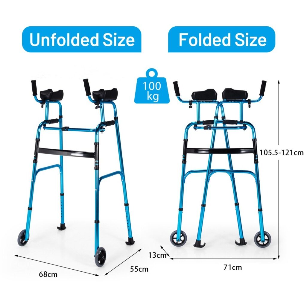 There is a portable wheel walker with armrest for the adults with limited mobility. This standard walker is made of firm aluminum alloy, which gives a stable construction and a high loading capacity of up to 100kg. And the universal wheels, brake wheels and soft armrest of this walking frame gives the comfort and safety guarantee. Our walker has 7-levle height adjustment function and 4-level adjustable armrest, which can be widely applied to people of different heights. In addition, the standard walker with one-click folding design is easy to carry and store. This adjustable folding standard walker provides more comfort and convenience, and will be the intimate companion for adults with limited mobility!
