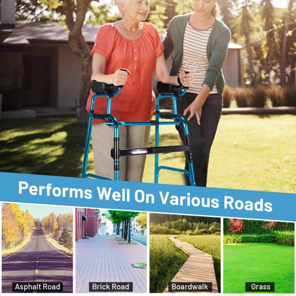 【Considerate & Ergonomic Design】The PU armrests are soft and skin-friendly to touch, while the sponge handles are comfortable and convenient to grip. Installation with no tools required makes the walker easy to use. Besides, two sled-type foot pads reduce friction for smooth movement and increase wear resistance for long time use.
