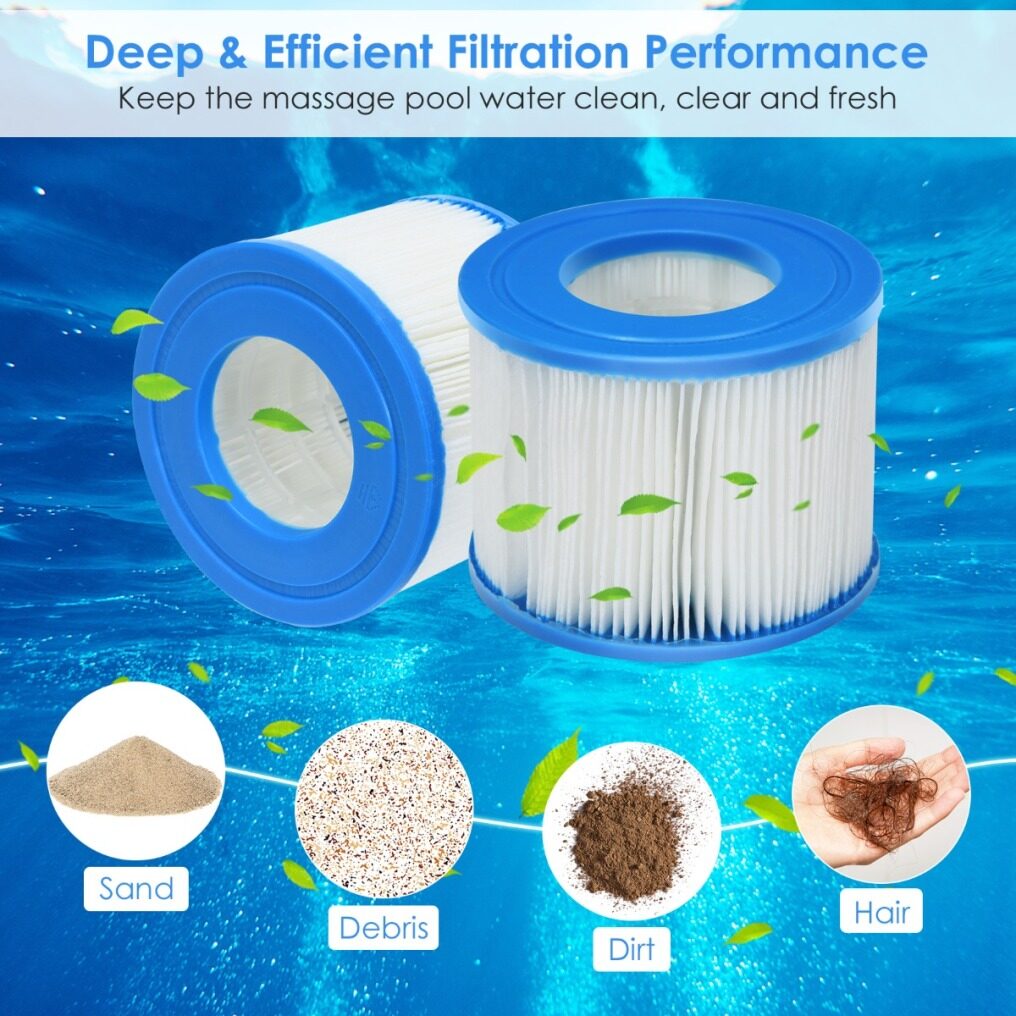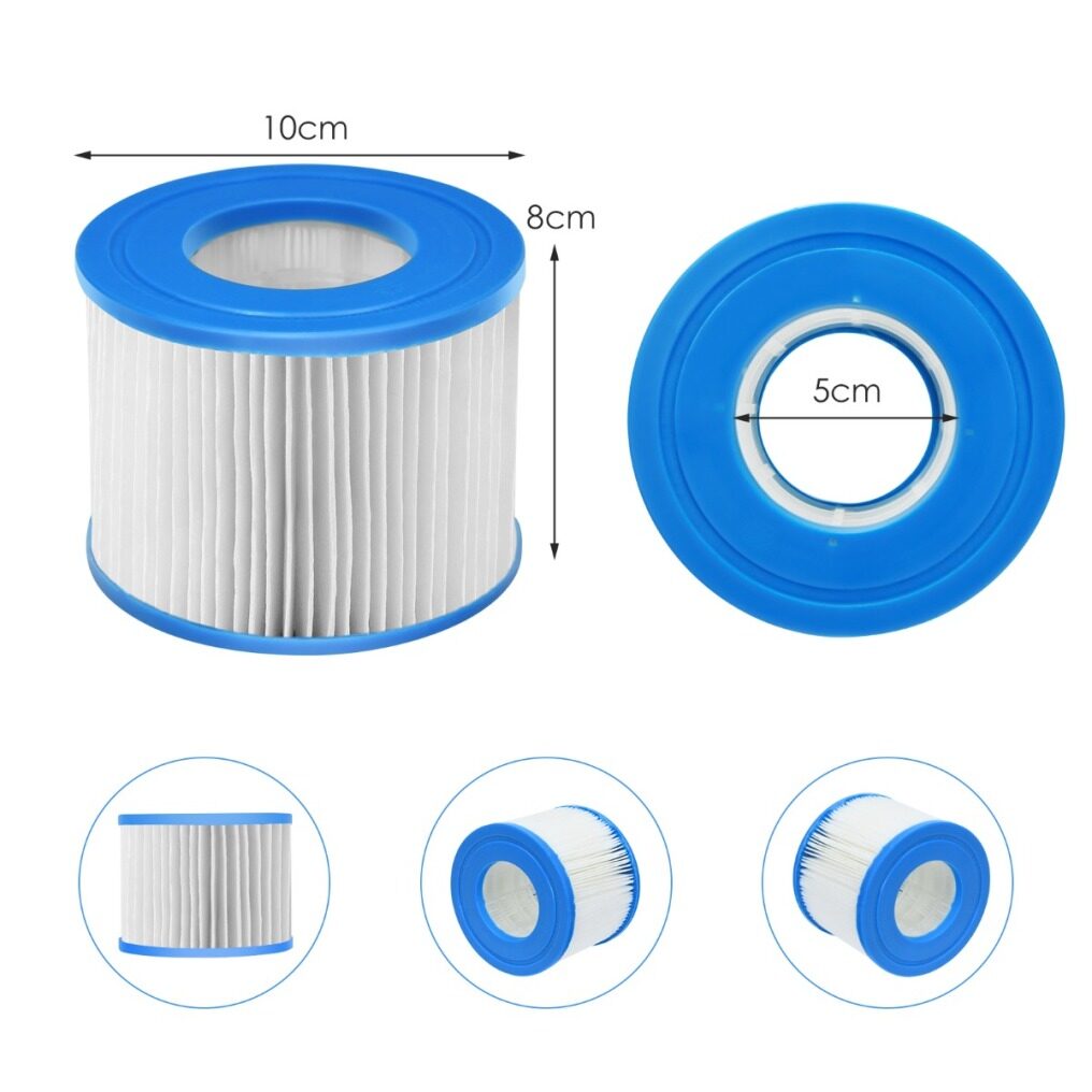 6 Packs Filter Cartridges: The filter cartridge measures 8cm in height, 10cm in outer diameter and 5cm in inner diameter, making it compatible with most massage pools, outdoor swimming pools, inflatable pools, etc. Moreover, they are conveniently sold in 6 packs.
