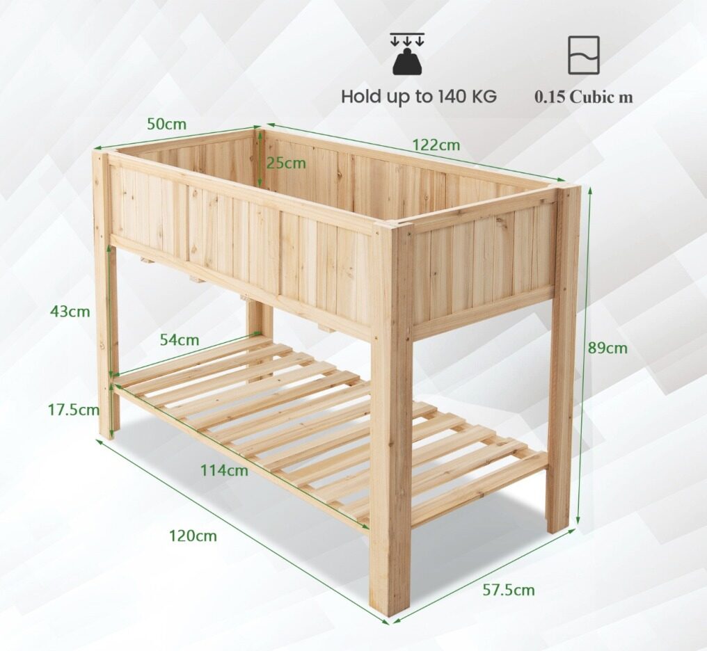 Sturdy Fir Wood Structure: The garden bed is made of natural fir wood for excellent strength and durability and is suitable for outdoor use. In addition, four reinforced crossbars at the bottom of the planter box and four 6cm thick legs make the garden bed stable and strong, bearing 140kg.