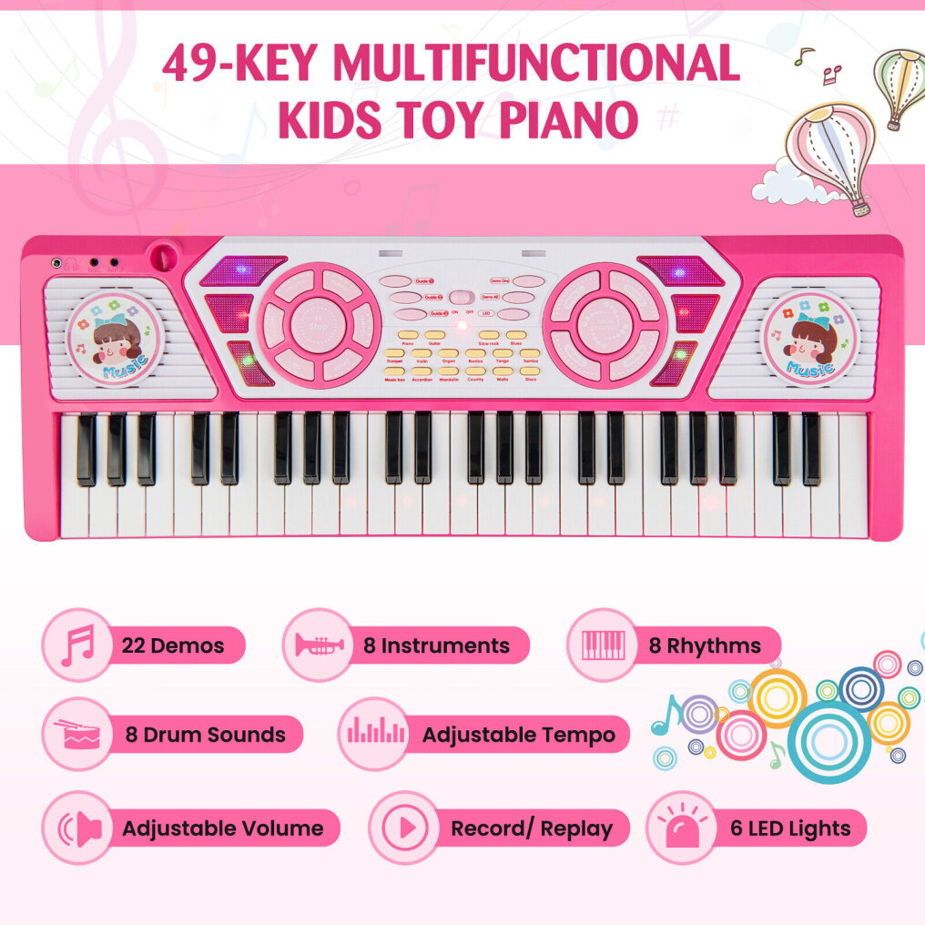 ● Multiple Preset Music Modes: This 49 keys piano keyboard for kids features 22 demo songs, 8 instruments, 8 rhythms and 8 drums. These various modes make children feel the charms of different combinations of notes and bring kids into the fantastic world of music.