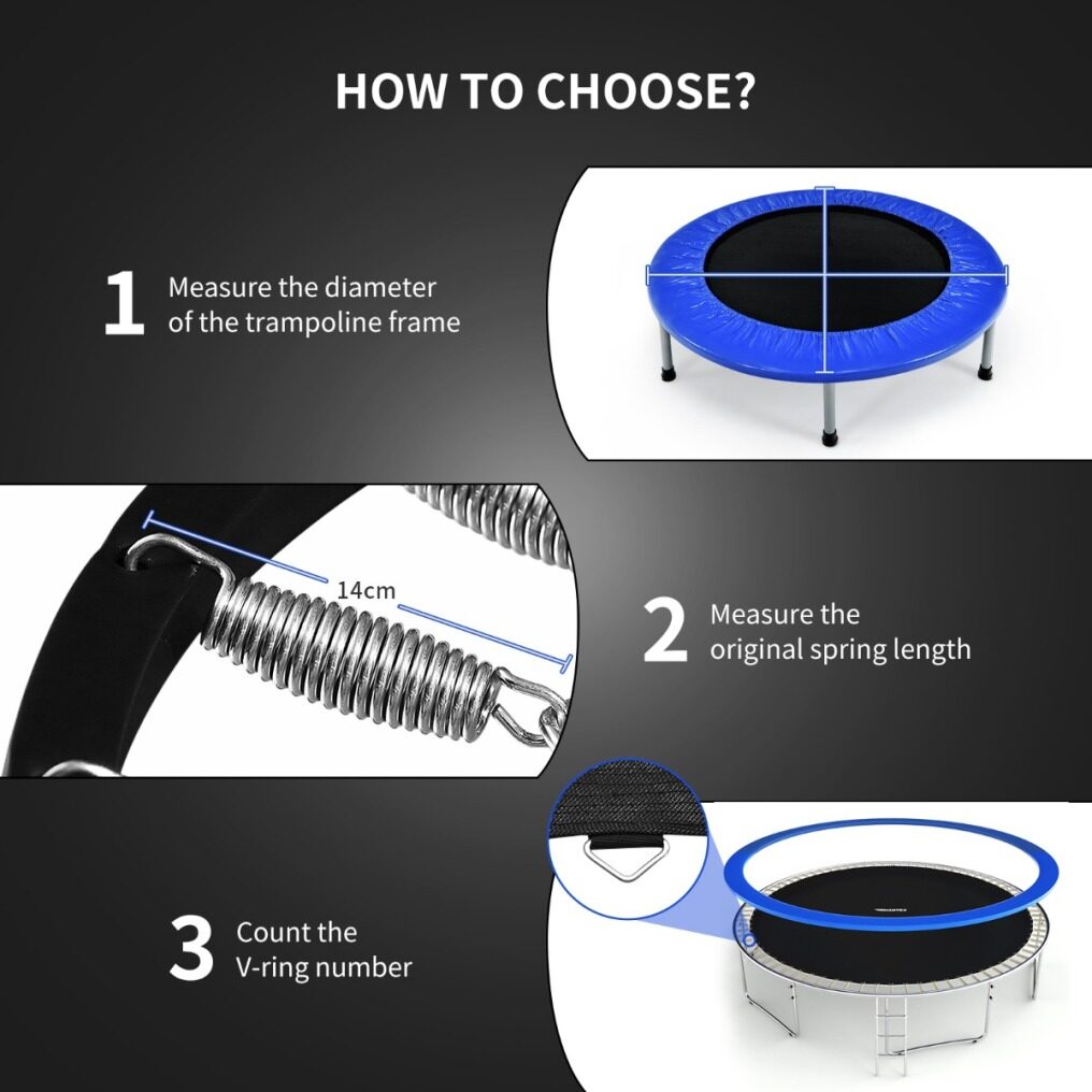 ● Choose An Ideal Replacement Mat: At the beginning, you should measure the diameter of the trampoline frame. And then count the spring length and V-ring number. And this jumping mat is compatible with round trampoline frame and 5.5" spring in length.