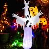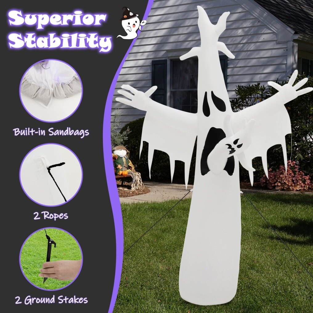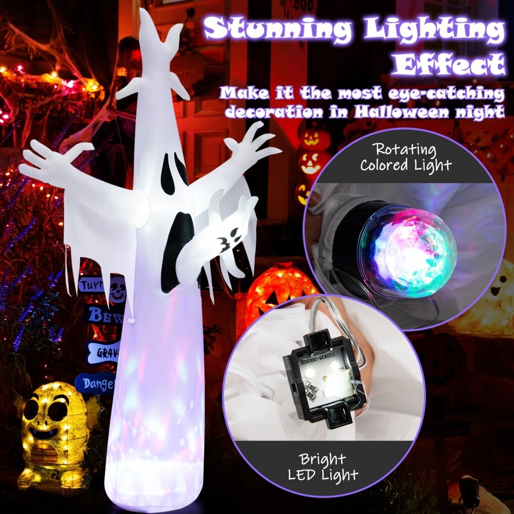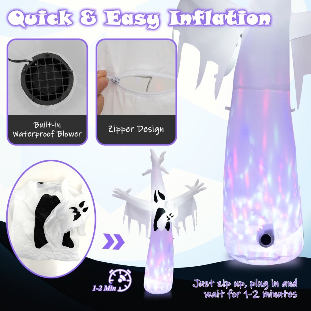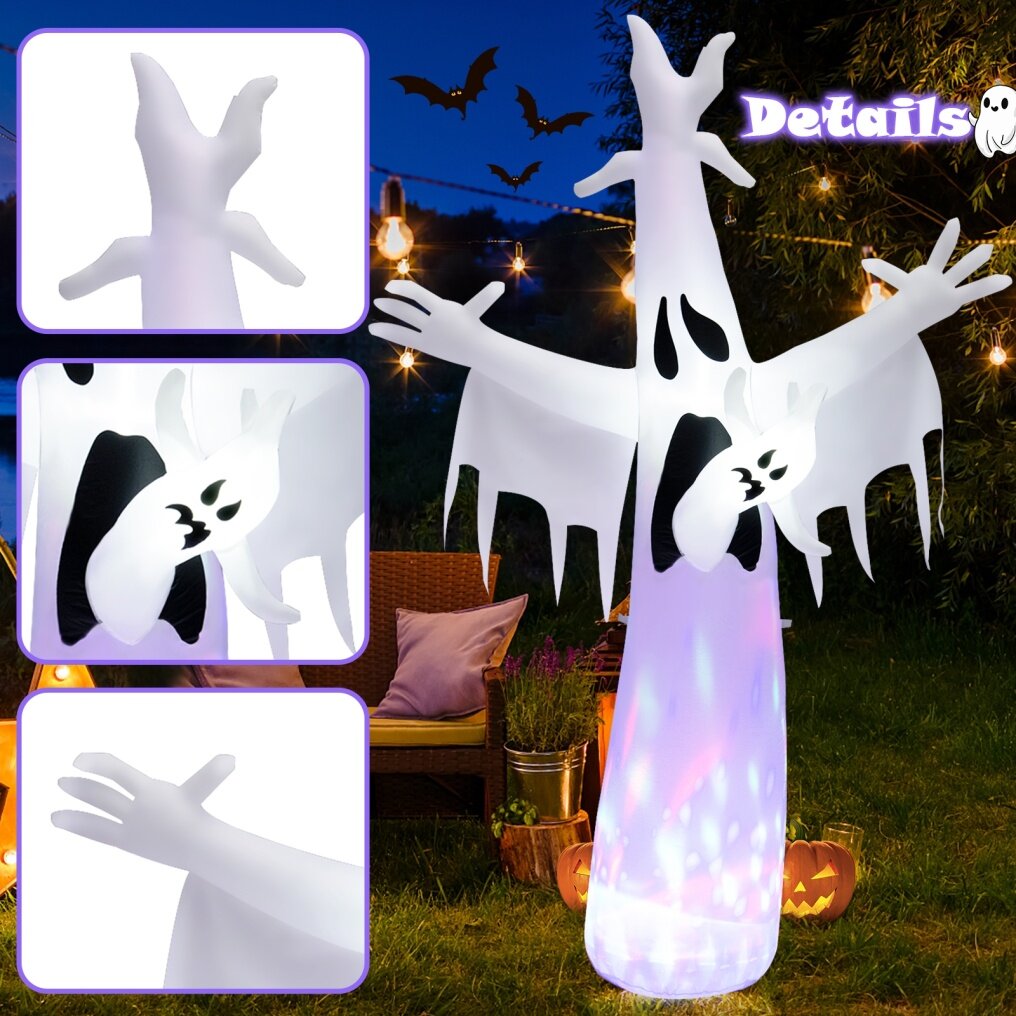 You can easily set it up on the lawn, for there are different stabilization measures including sandbags, anti-wind ropes as well as ground stakes. What's more, the inflated ghost stands 8 ft tall, which is really conspicuous in the neighborhood. And the design of the small ghost coming out of the mouth makes the whole decoration look even more creepy. Besides, the ghost is equipped with a unique rotating bottom light, which gives out colorful glows for a magical scene. Therefore, this giant inflatable ghost will definitely become a big hit!