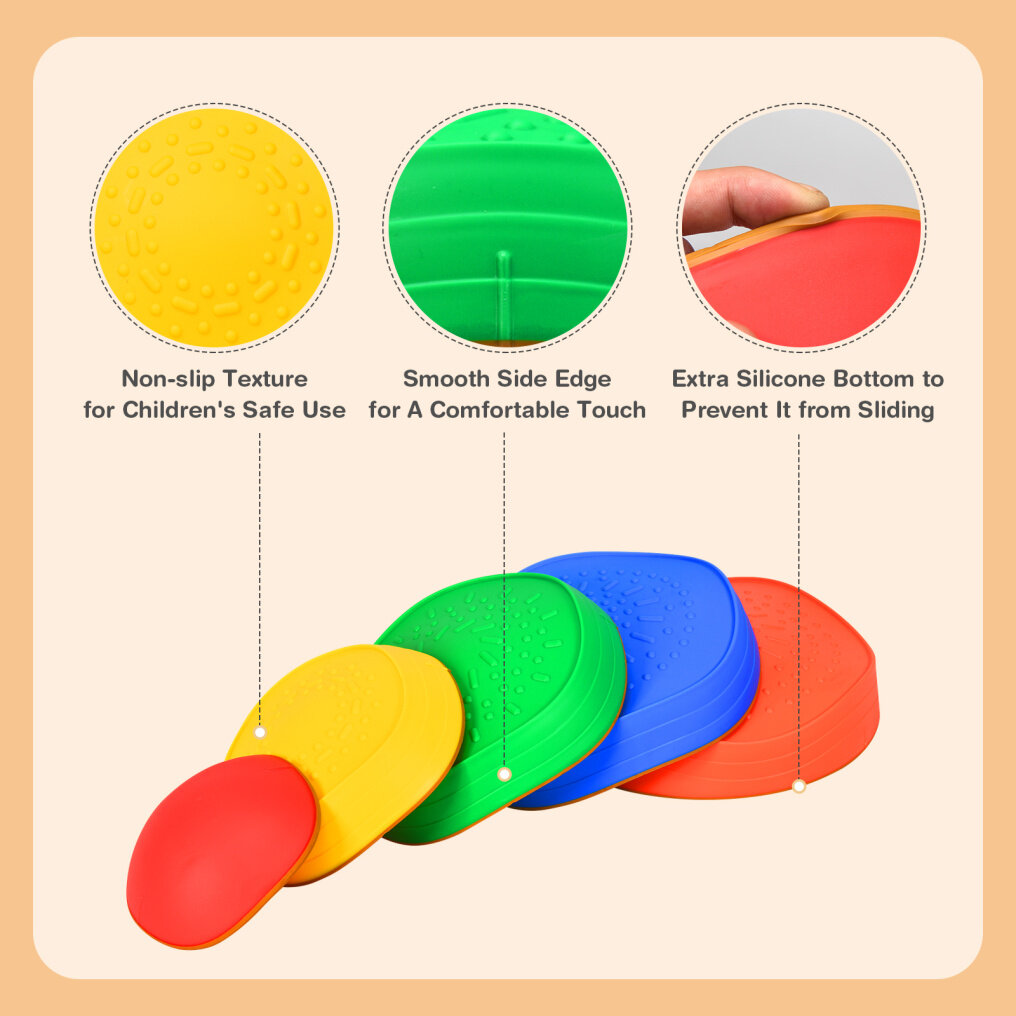● Promote Balance and Coordination:With different distances among the stones, this toy set helps kids practice their balance and coordination skills in walking, running, jumping and playing sports.In addition, the colorfulstepping stones toy encourages children to jump, stretchand other exercises.
