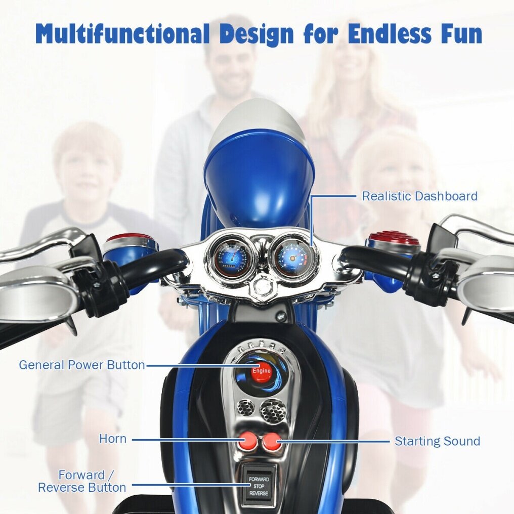 It features an eye-catching design, better than other ordinary ones, letting your kids show their perfect side during driving. More, kids can drive forward or backward as they want. Meanwhile, the 3-Wheel structure keeps stable all the time to protect your kids. It is also designed with a headlight, bring bright light in the darkness, which can be adjusted in the direction as well, to meet kids’ different requirements. Meanwhile, built-in music would let kids drive a relaxed atmosphere. Plus, wear-resistant wheels allow it for riding on different kinds of ground, either indoors or outdoor. Safety materials and ASTM certification leave you with no worry about using reliability. There is no better toy than this chopper-style motorcycle. This product is not sold in California