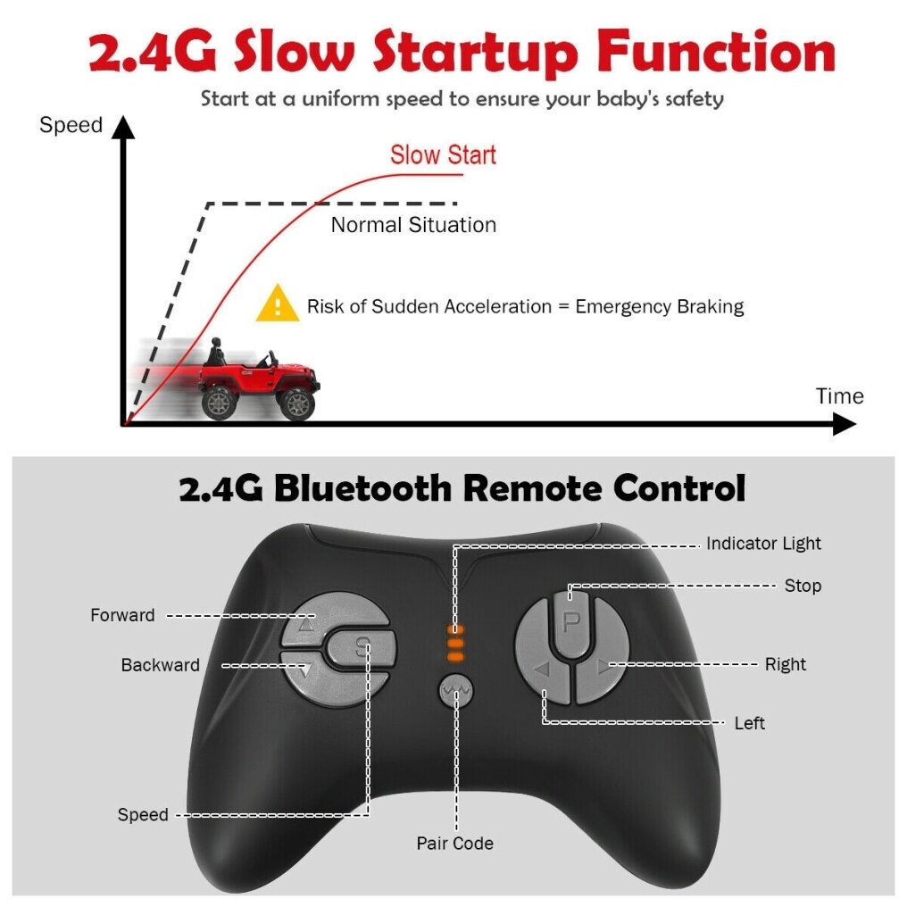 ● Security Assurance: The kid's car is equipped with a slow start function to avoid the risk of sudden acceleration. Besides, 4 wear-resistant wheels are made of superior PP material without leaking or tire burst. Its spring suspension system and seat with multi-point safety belt offer a safer driving experience.