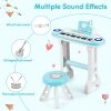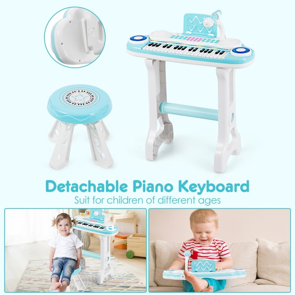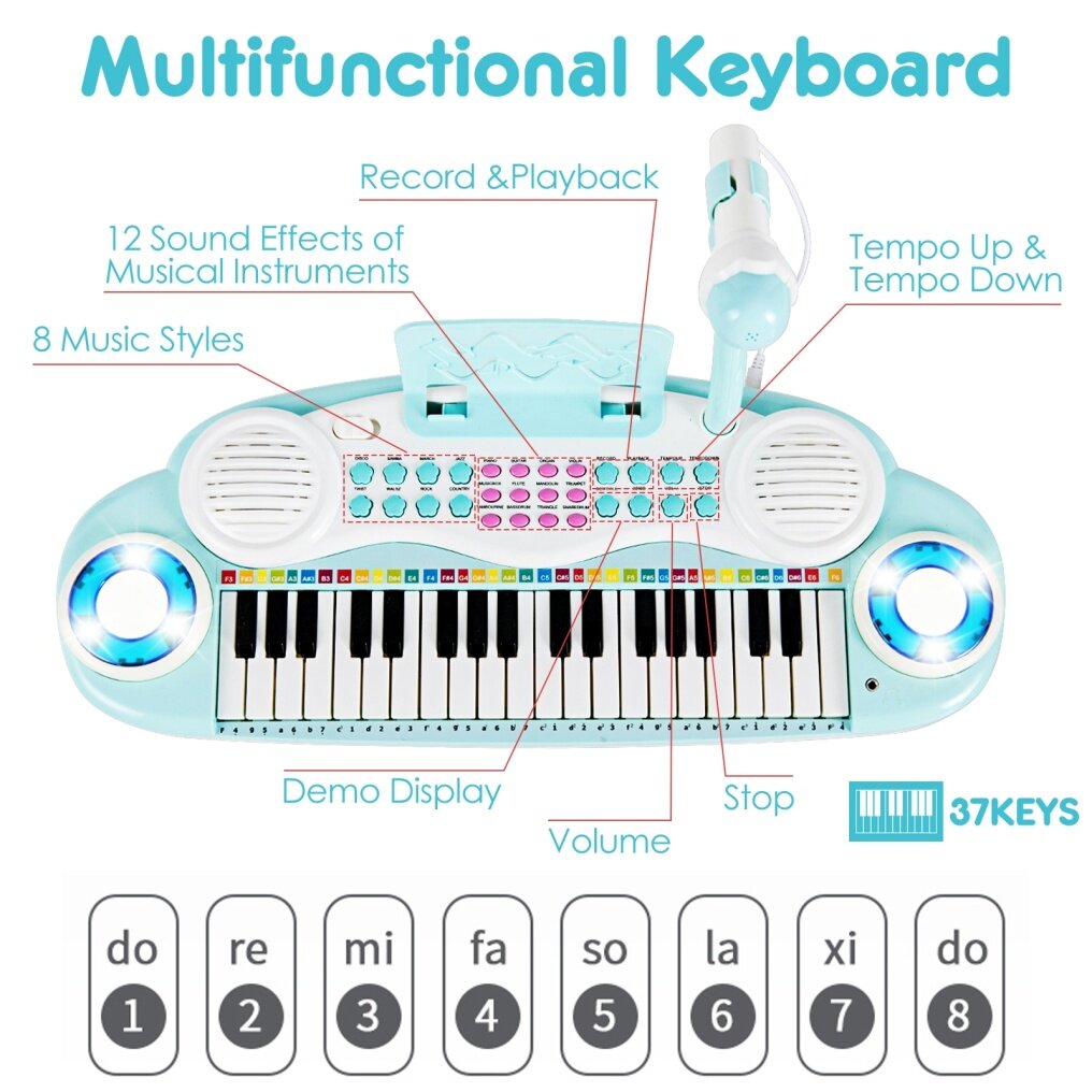 The 37-key toy piano is designed for kids with multiply functions including 8 rhythms, 8 instrument sounds, 4 percussion sounds and demo songs for a little toddler musician to perform freely.