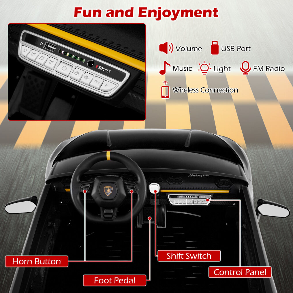 ● Real 2-Seater Toy Car: The electric ride on car features 2 spacious seats with a total width of 20", which is large enough for 2 kids to enjoy riding. With lockable doors, bright headlights, and cool rearview mirrors, the licensed Lamborghini car toy provides you with an immersive driving experience.