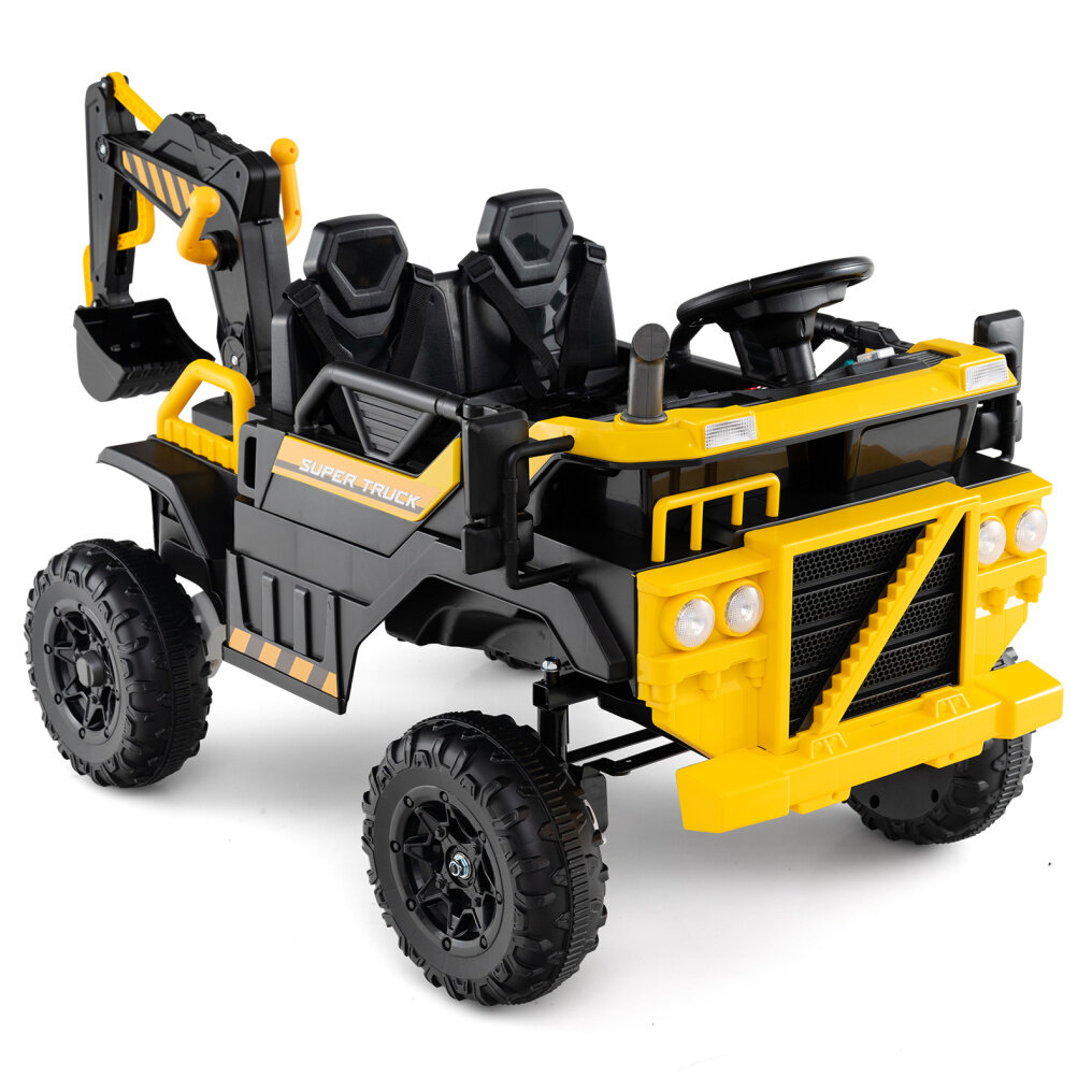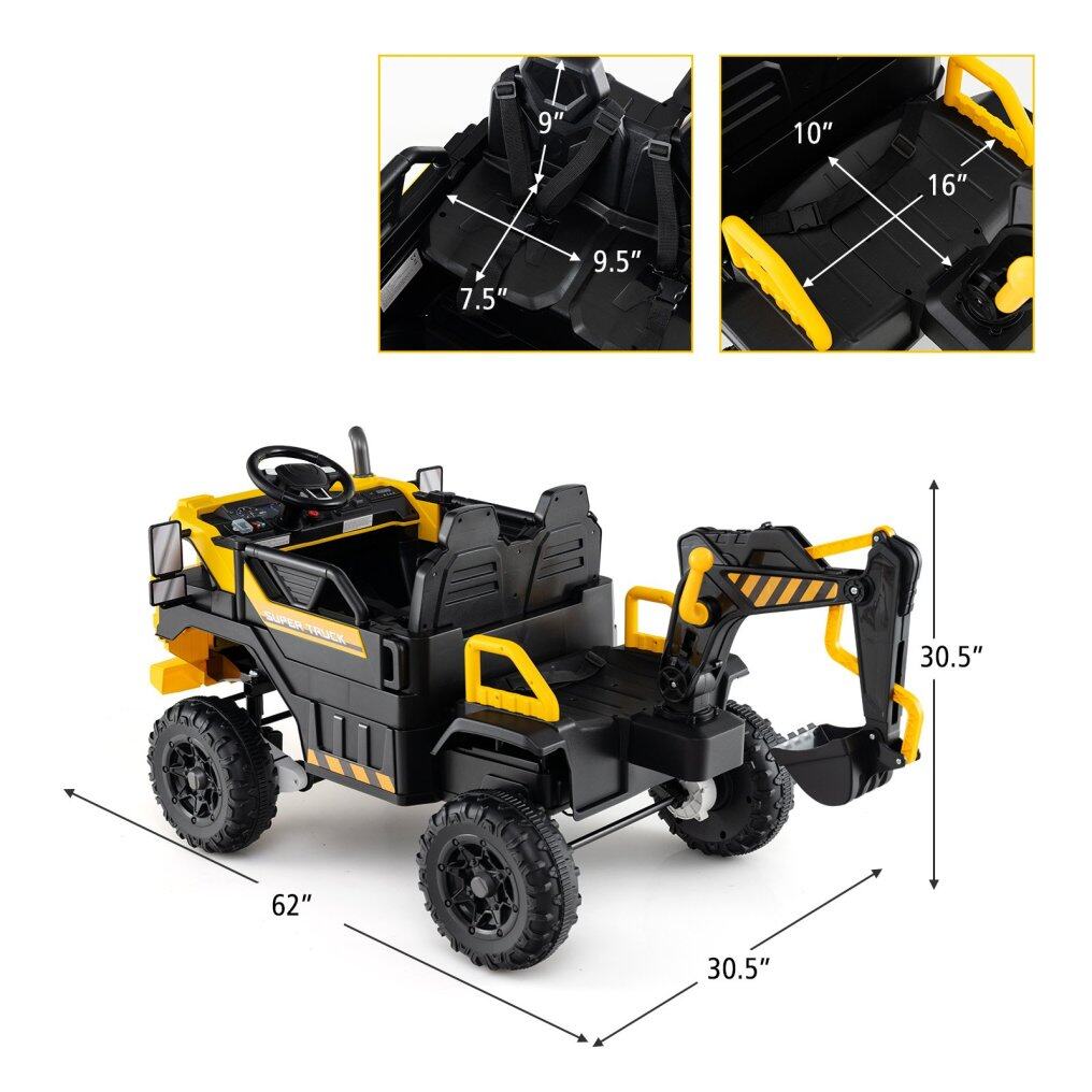 ● Truck & Excavator Combo: This kids ride on excavator doubles as a 2-seat ride-on car, letting children dig with dual levers and then drive off together. Parents can take over anytime with the included remote, making this electric construction vehicle the safest way to share backyard adventures.