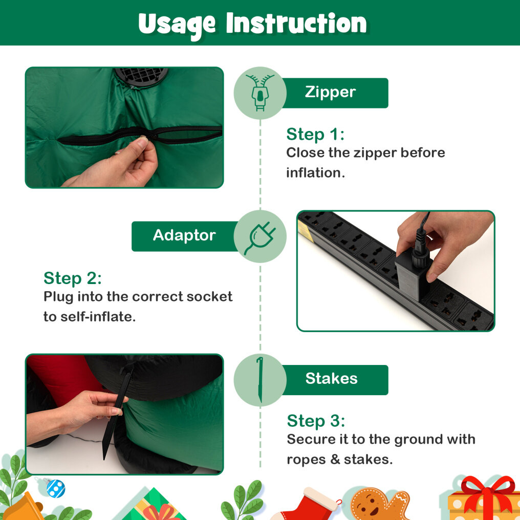 Besides, when night falls, the built-in LED lights make the whole decoration even more eye-catching, especially in a dim environment. In addition, the decoration is very easy to inflate because of the built-in blower and zipper design, the former of which inflates quickly and the latter ensures certain airtightness. What is more, in order to serve better in the outdoors, the Christmas inflatable is made of high-quality polyester fabric and consists of waterproof parts, paired with fixing accessories, such as sandbags, ground spikes and ropes, to maintain good stability and durability.