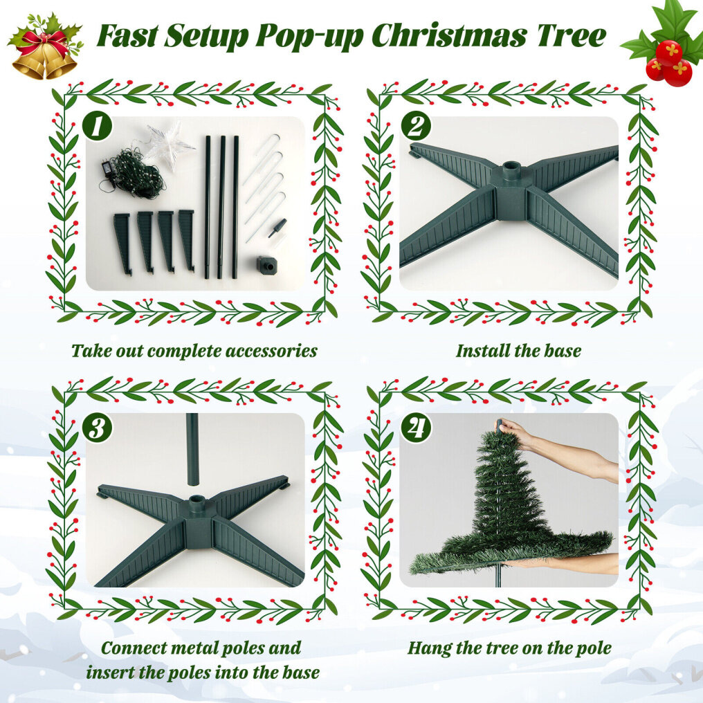 Convenient Pop-up Design: Thanks to the clever pop-up design of the Christmas tree, you can quickly get a tall and beautiful Christmas decoration by simply connecting two metal poles and attaching them to the base, then hanging the tree on the pole and installing the tree top star, which is energy-saving.