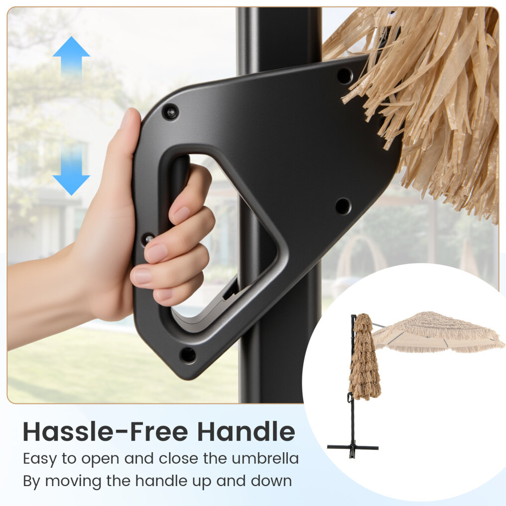The cantilever patio umbrella is designed with a polyester canopy with PE thatch, providing effective shielding from the sun. Meanwhile, the Hawaiian style thatch will add visual delight to your backyard, outdoor cafe, poolside or deck. The 268 cm hula thatch umbrella features a user-friendly handle that enables effortless opening and closing. For convenient storage, the offset hanging umbrella can be quickly taken apart into 2 components. Coming with 2-tier vented top, the heavy-duty outdoor umbrella facilitates better air circulation and minimizing wind impact. Furthermore, a robust metal frame and 6 umbrella ribs ensure a sturdy structure.