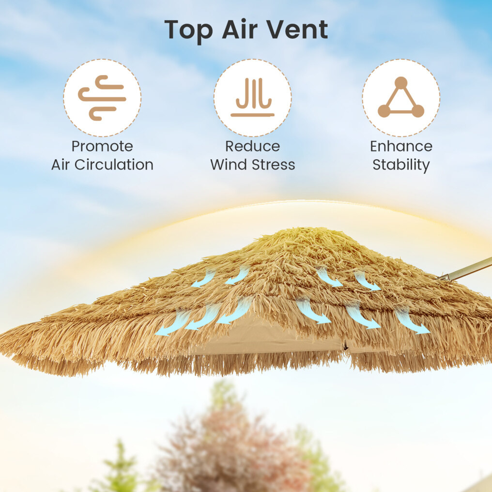 2-tier Vented Canopy: The 2-tier vented tiki patio umbrella is designed to facilitate optimal air flow and minimize wind pressure. This thoughtful design not only keeps your shaded area pleasantly cool but also contributes to the overall stability of the umbrella.