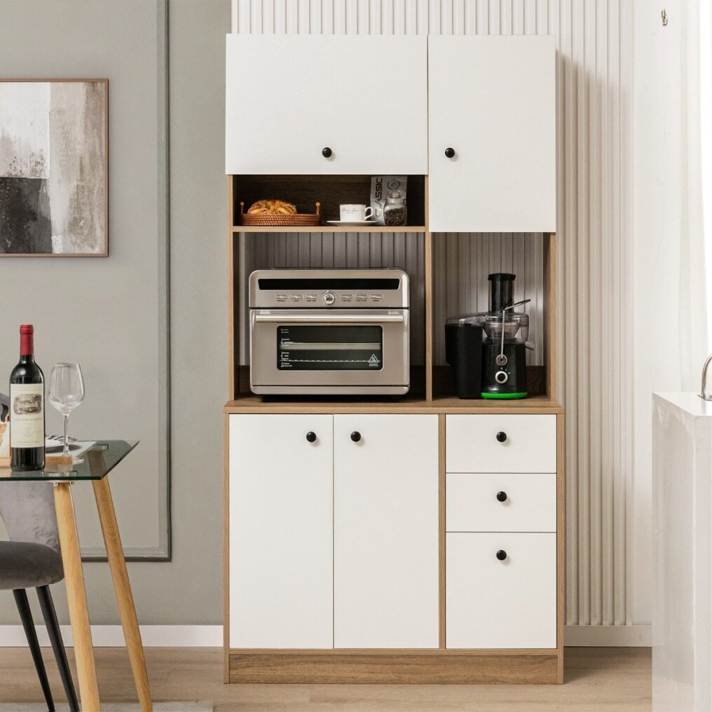 Need extra storage space for your kitchen? The spacious countertop, 3 cabinets, 1 open compartment and 3 deep pull-out drawers provide ample storage space for your kitchenware, dinnerware, microwave oven, wine, glasses, condiments, etc. And 2 adjustable shelves enable you to customize the space as needed, which is easy to move and adjust. Moreover, the open design allows for easy cable management. The combination of sturdy structure and anti-toppling fitting ensure the tall pantry cabinet is as stable as possible. Apart from using it to tidy up your kitchen, you can also place the modern and practical storage organizer in the dining room and living room as you wish.