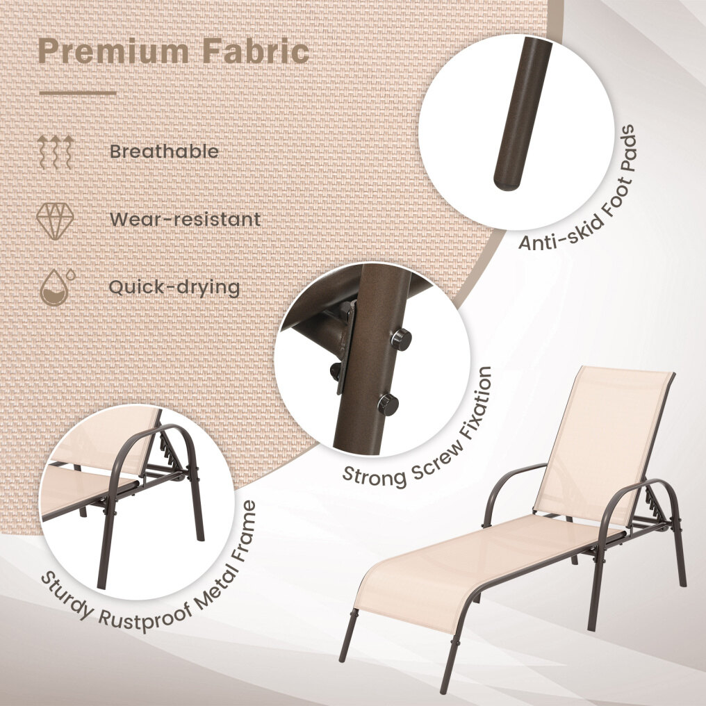 Breathable Fabric & Simple Assembly: The seat is made of breathable fabrics, so that you will not feel stuffy even in the hot summer. The fabric can dry quickly, so this recliner is suitable for outdoor use. According to the detailed instruction, you will spend less time assembling the chaise lounge and have more time to enjoy it.