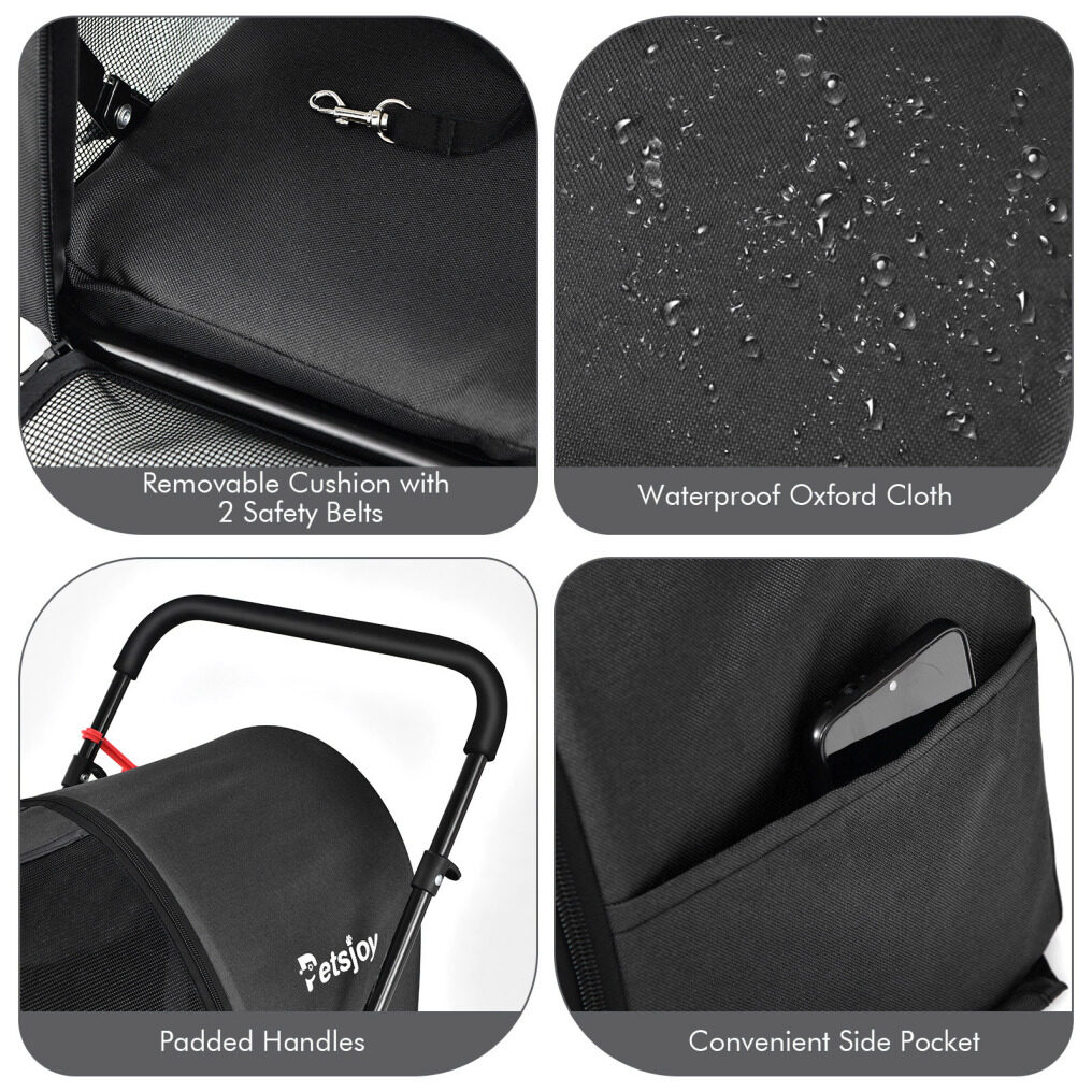 Safe & Smooth Travelling: The folding pet stroller has two safety belts inside each tier to prevent your pet from running out. What's more, the folding pet stroller has 4 shock-absorbing EVA wheels that allow your beloved pet to enjoy a restful sleep even on rough terrain. 2 of them are 360° swivel wheels to keep flexible mobility, and 2 are lockable wheels with brakes to ensure that the stroller is parked in a safe place.