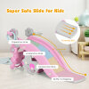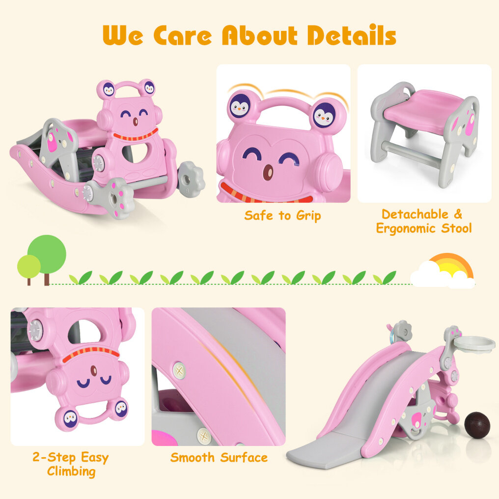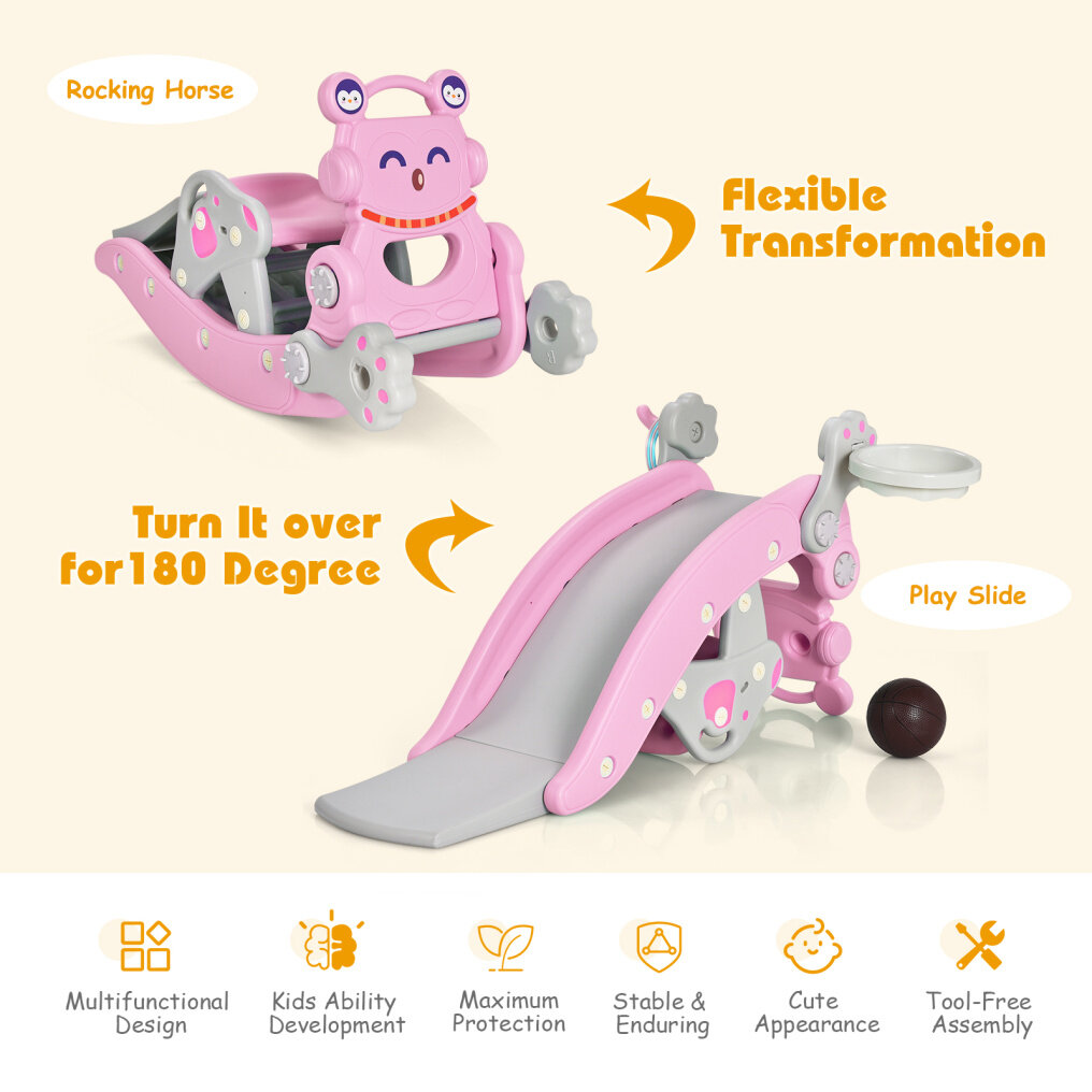 4-in-1 Joy for Kids: This rocking horse set can be transformed from a rocking horse to a slide after detaching the seat. Besides, is equipped with a basketball hoop for kids to try shooting, and also offers the ring-toss game, which makes it a multifunctional rocking horse and slides to bring more fun.