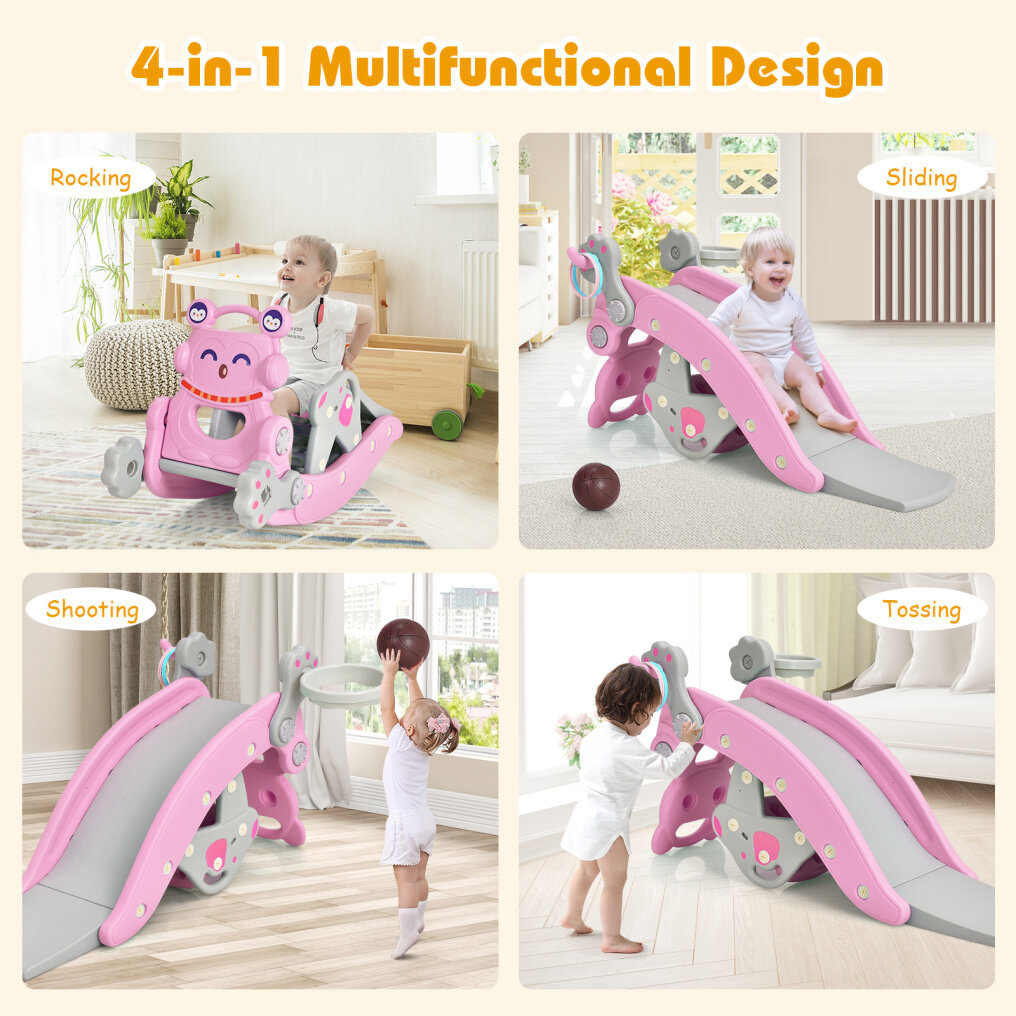 4-in-1 design with the game of sliding, swinging, basketball and ring-toss