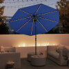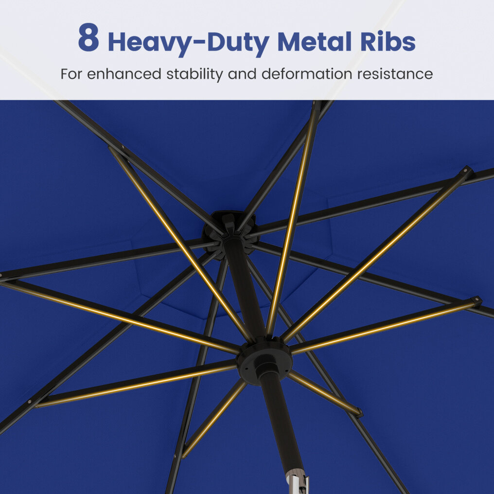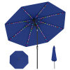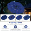 ●Vibrant Lighting Display: This 10 ft patio umbrella is adorned with 96 bright LED lights, which offer 9 lighting modes, including 4 static colors (red/blue/green/white), 4 dynamic modes, and 1 multi-color mode, suiting various moods and occasions. The lights are powered by an energy-saving solar panel, and effortlessly controlled via a handy switch.