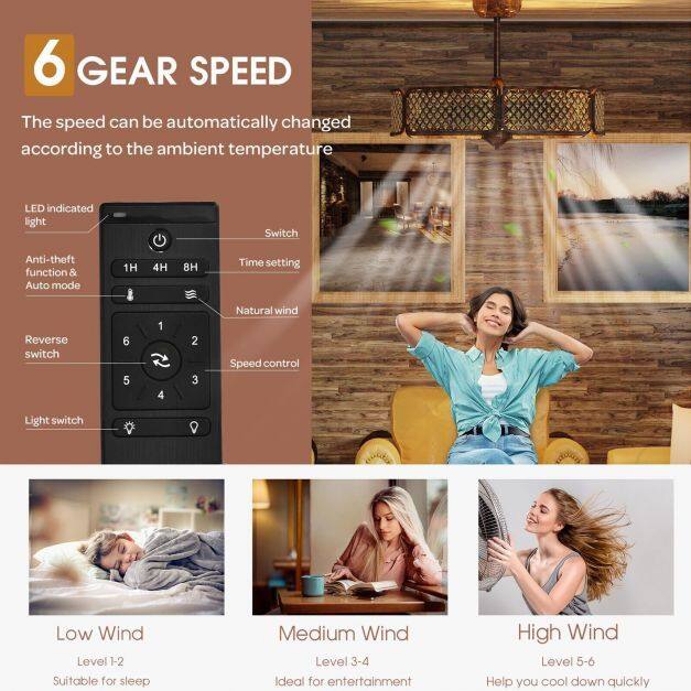 6 Adjustable Fan Speeds: The fan speed can be adjusted into 6 levels from low to high based on your demands. And the auto mode with heat sensing system enables the ceiling fan to change the speed automatically according to the ambient temperature. All of these settings can be operated on the remote control.