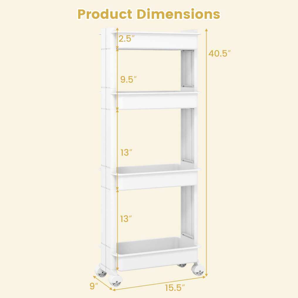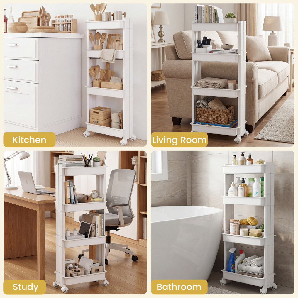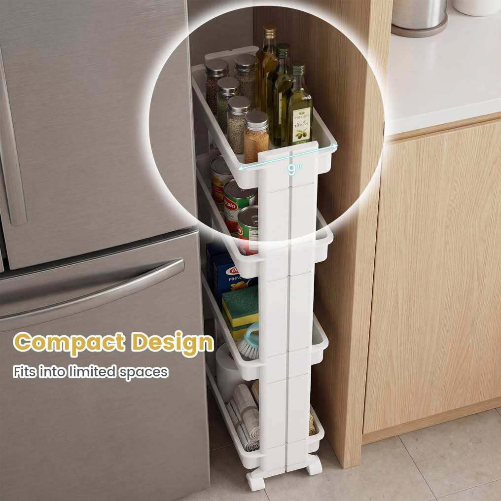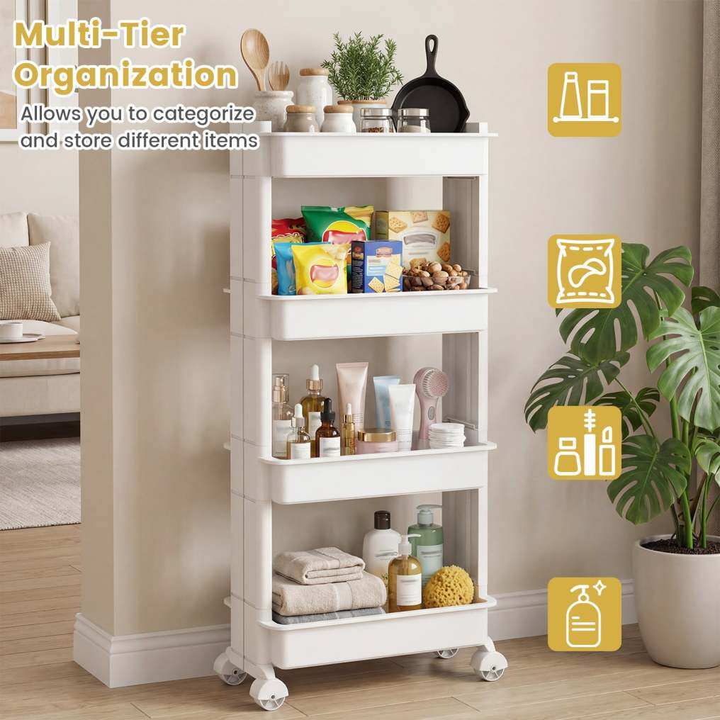 Multi-Tier Organization: Offering multiple tiers, the multifunctional storage trolley allows you to categorize and store different items effortlessly. It is ideal for keeping your space neatly arranged by designating each shelf for specific belongings, such as spices, snacks, vegetables, etc.