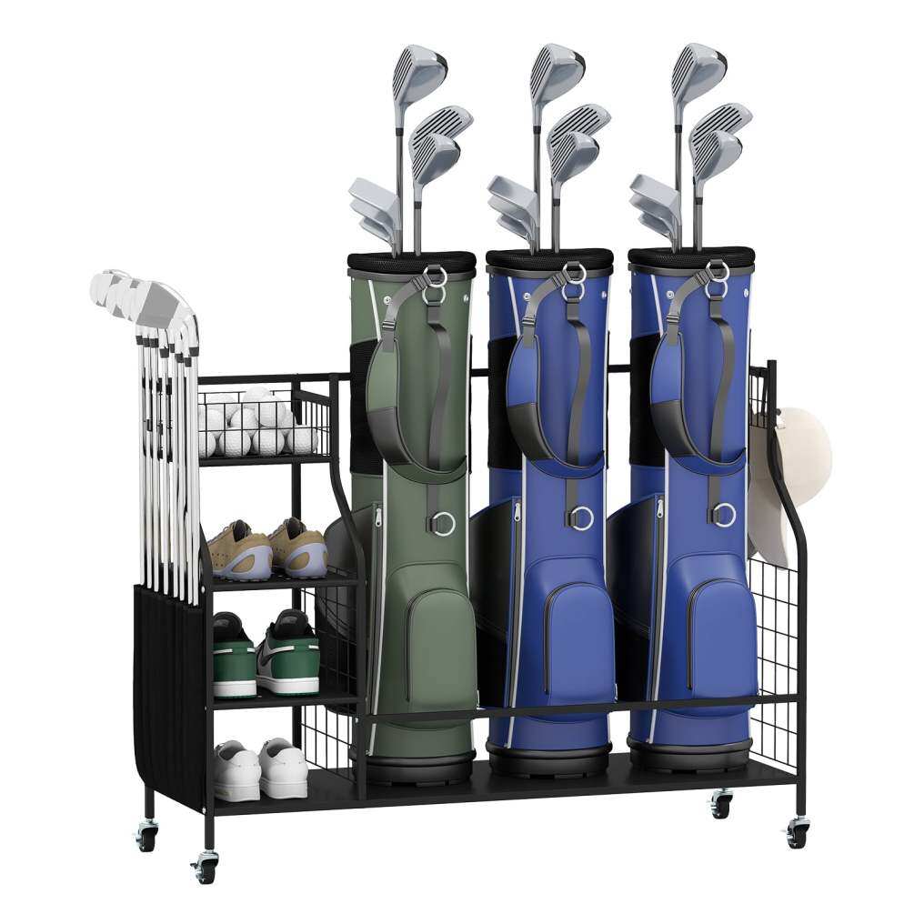 Large Storage Capacity: This golf equipment storage organizer features a spacious space for holding up to 3 golf bags, side storage pockets for holding up to 8 golf clubs, and 4 removable hooks, keeping your golf gear organized.